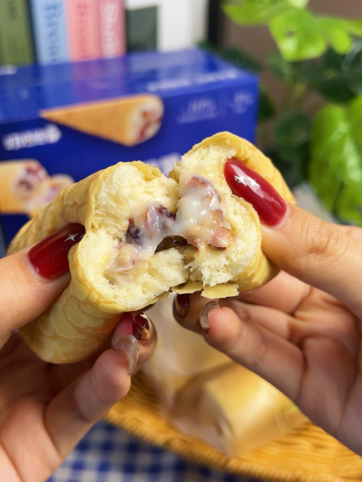 谁发明的这面包啊😭 清爽到犯规! ≥3% 鸡蛋入料 法式可丽饼更松软 满满四重果干坚果:蔓越莓 + 葡萄干 + 红枣丁 + 葵花籽 每口都能嚼到果干香甜与坚果脆感 层次超丰富,裹着巨满足的希腊酸奶酱 不爱吃甜腻面包的宝子,这款直接锁死! 无限回购款✅