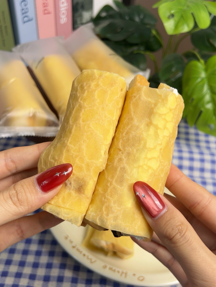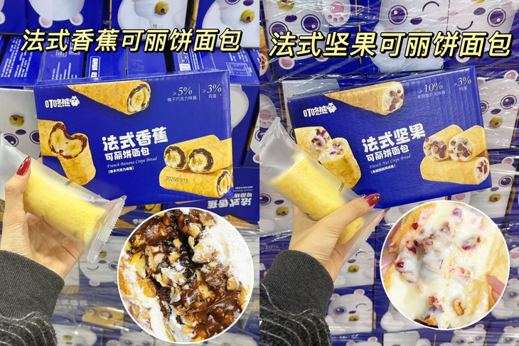 法式香蕉可丽饼面包(榛子巧克力味) 外皮松软湿润,冷吃都超绵密不噎口 裹着足足 ≥5% 榛子巧克力味酱 丝滑浓郁超香浓 还藏着 ≥2% 真实香蕉碎 果香清甜中和甜腻 搭配 ≥3% 鸡蛋 + 全脂乳粉 奶香麦香一口沦陷 甜而不齁,口感层次直接拉满✨