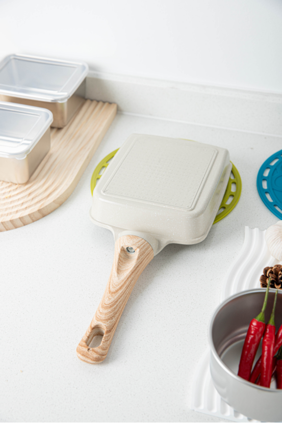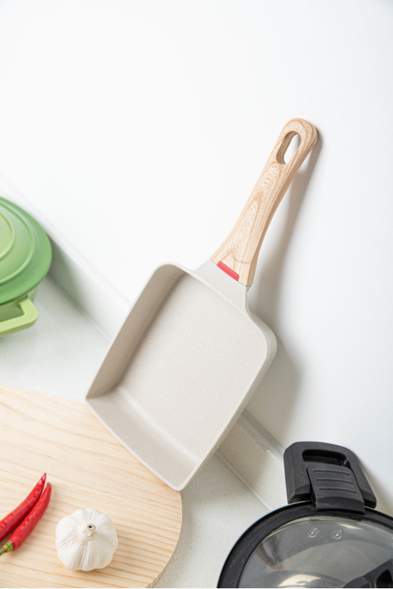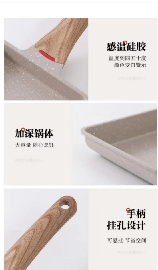 太神奇了吧,玉子烧锅居然有这么多种用法。 作为一口不粘锅,不粘是他的基本素养。铝压铸锅身 一体成型,小巧多能。无铆钉设计,清洗无死角。 隔热防烫手柄,还可以悬挂,家庭收纳必备。 1.煎饺子,煎牛排。 2.轻松制作厚蛋烧。 3.烤五花肉。