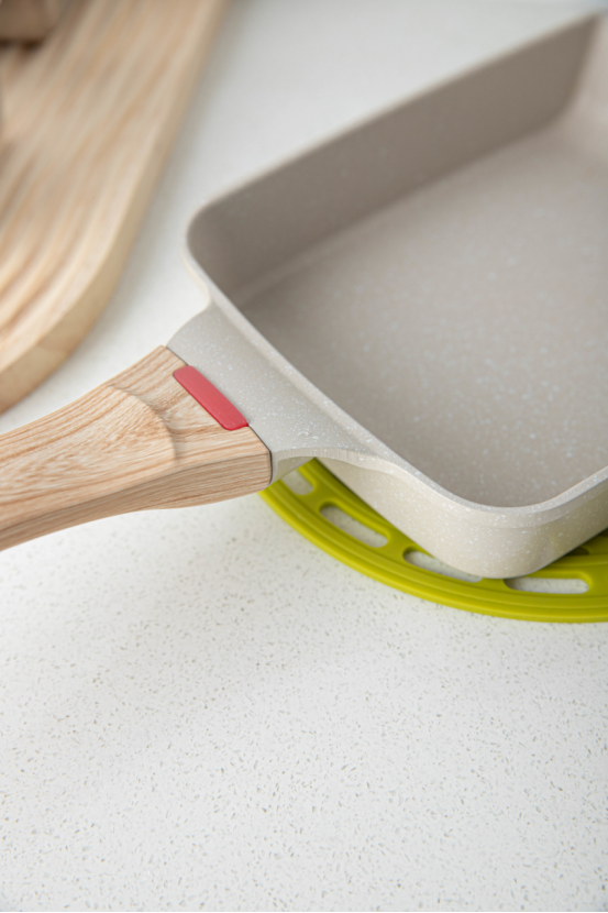 重点讲一下这个感温シリコンよいデザイン设计 注意咱们的锅柄有一个红点,这可不是拿来好看的哟 她是感温硅胶,高温会变色, 温度到达四五十度时颜色变白,不粘锅难以掌握温度,往往看不到温度,容易烧糊食物,一不小心烫伤手。 有这个感温点就不一样了,超温提醒,做菜随心而动,一目了然。