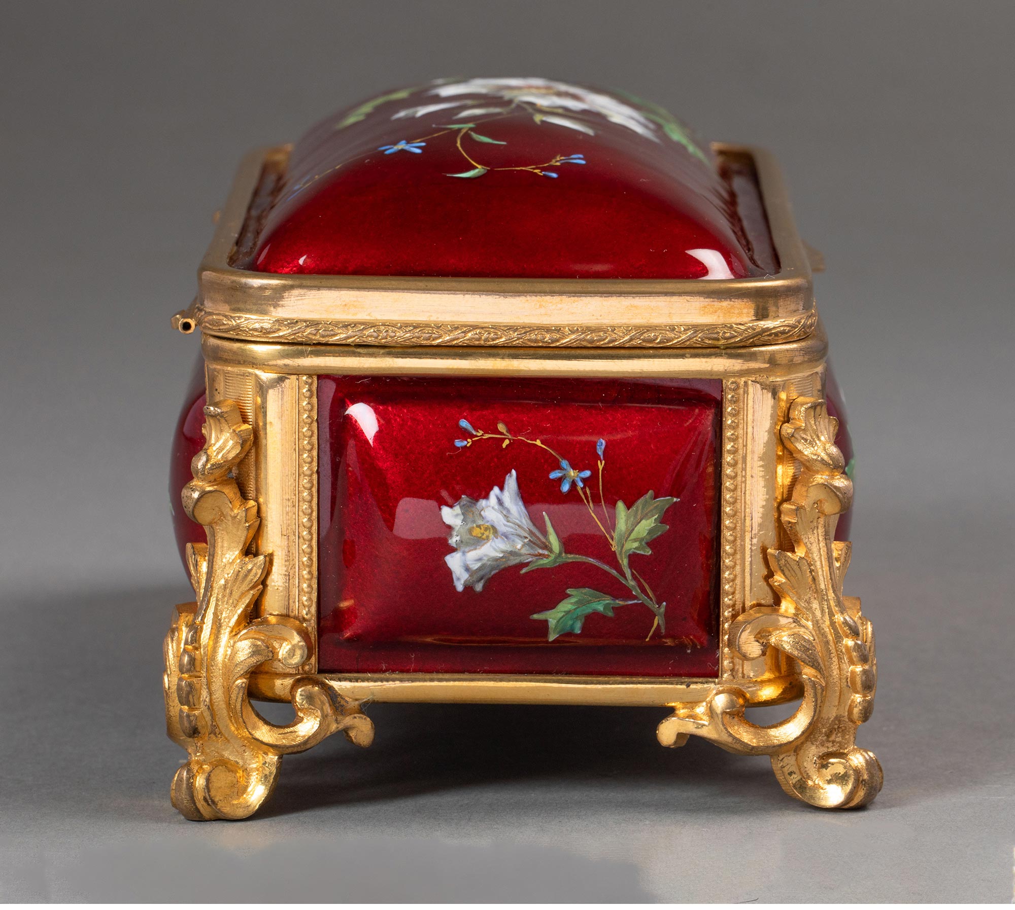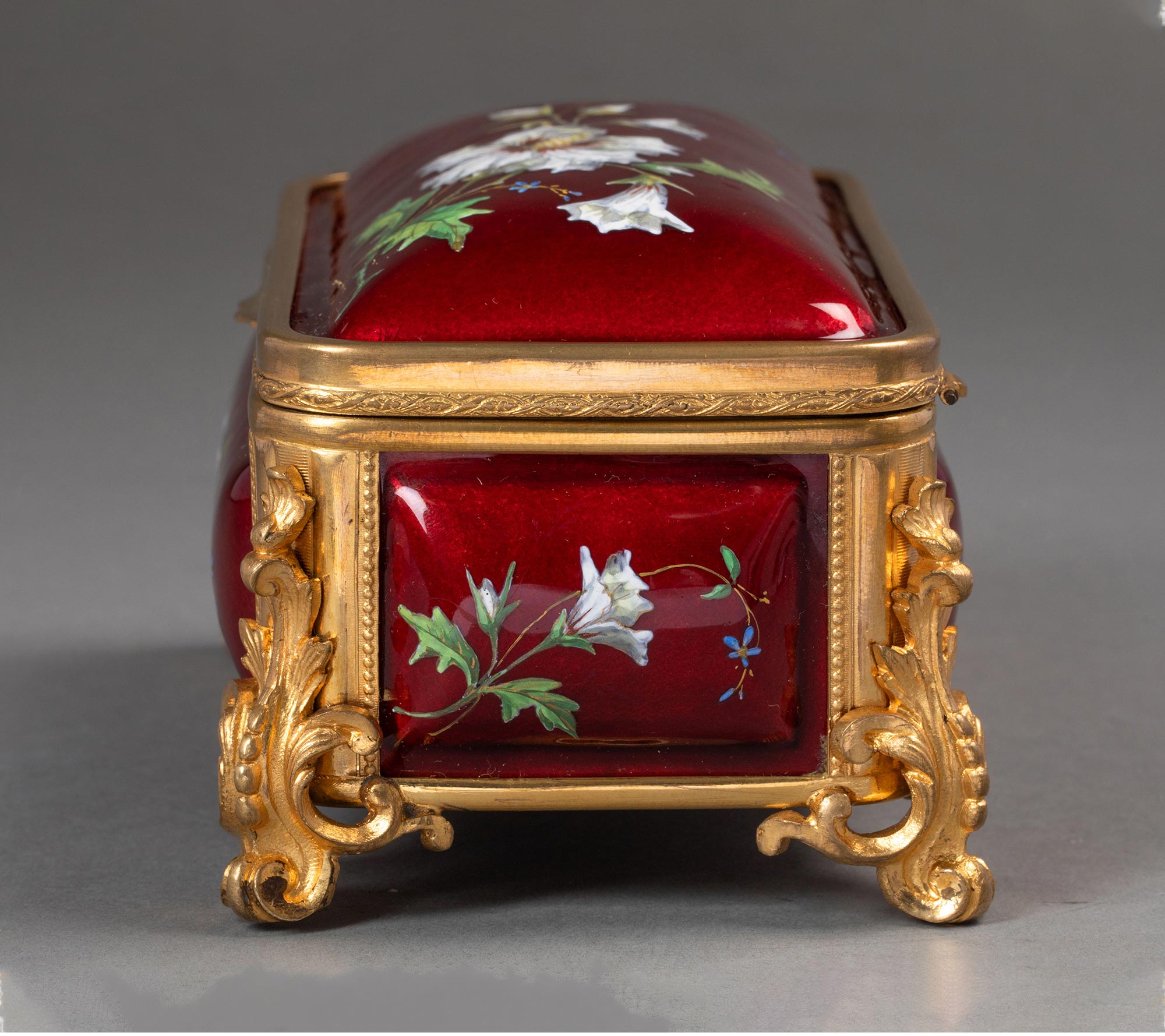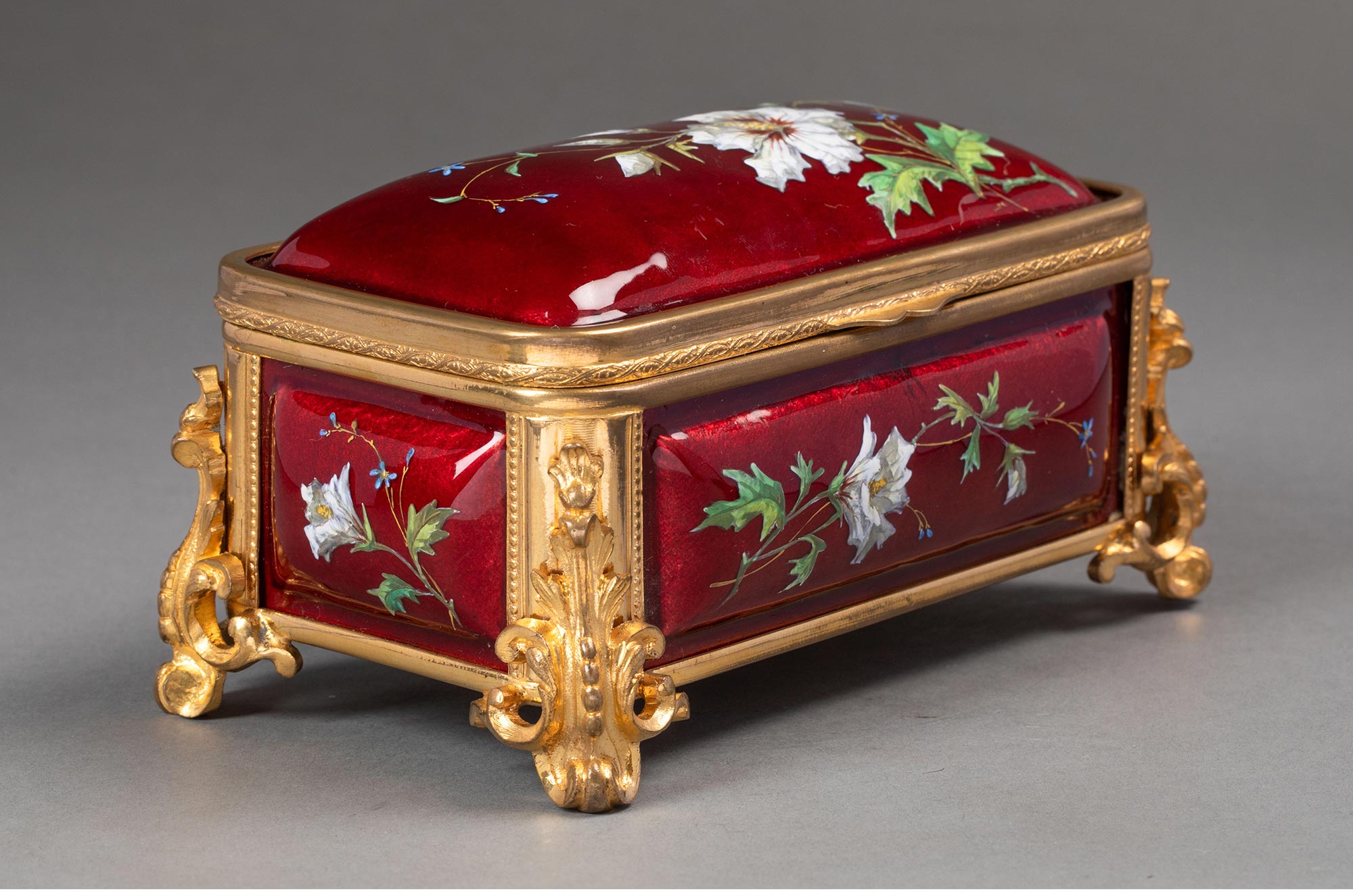 19世纪末法国出品卷叶纹铜鎏金精雕装饰自然花卉主题珐琅彩绘珍宝盒