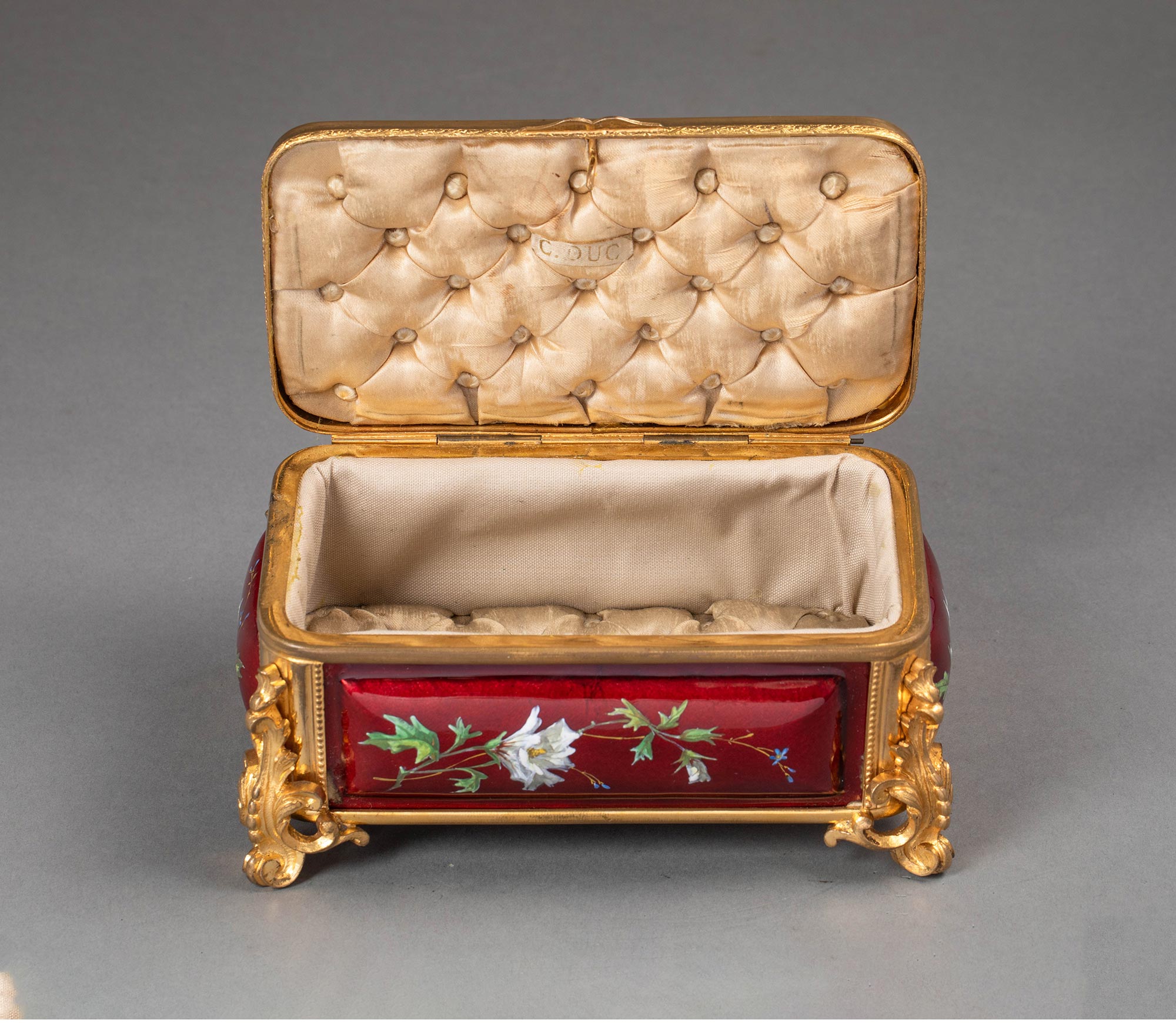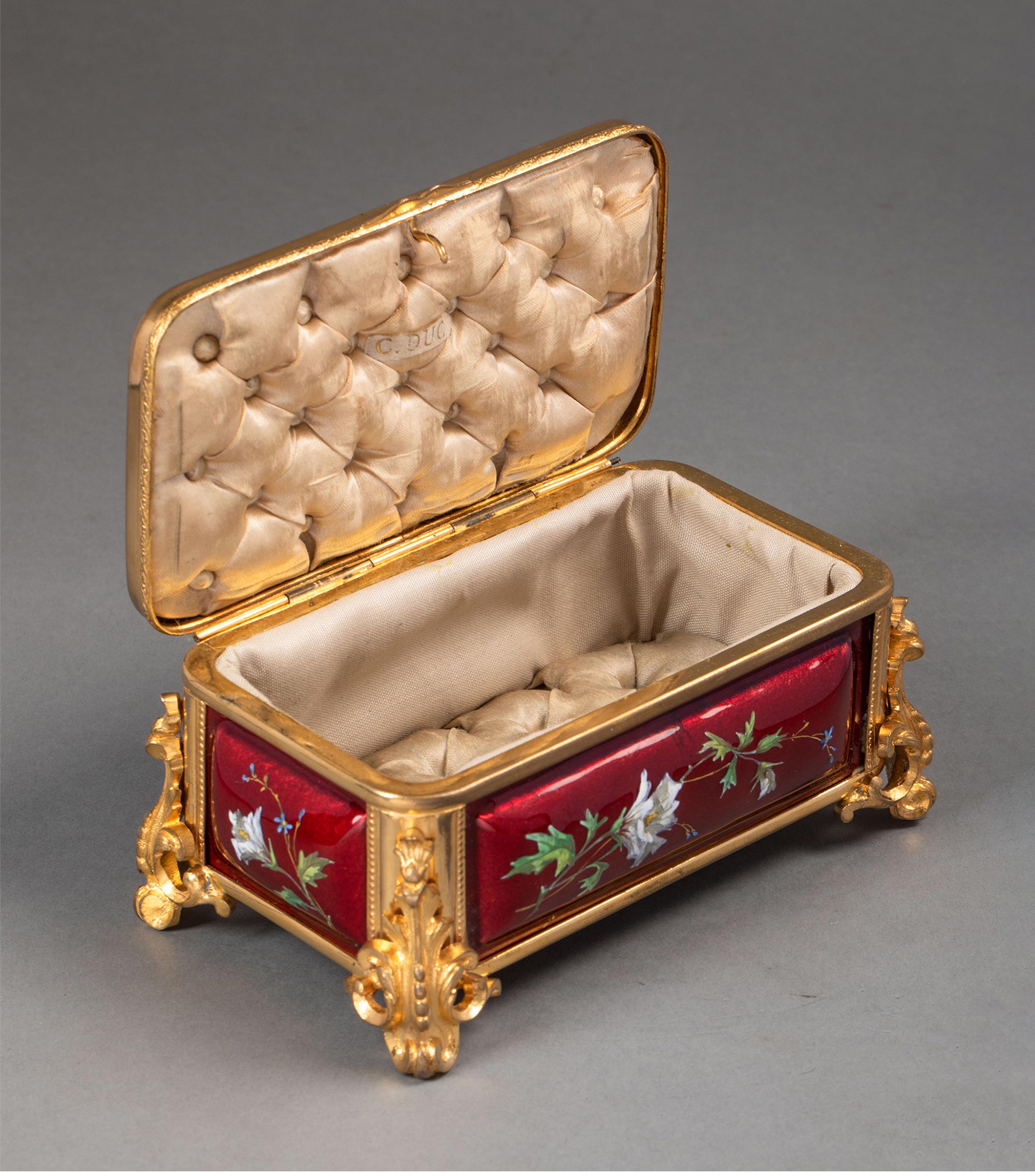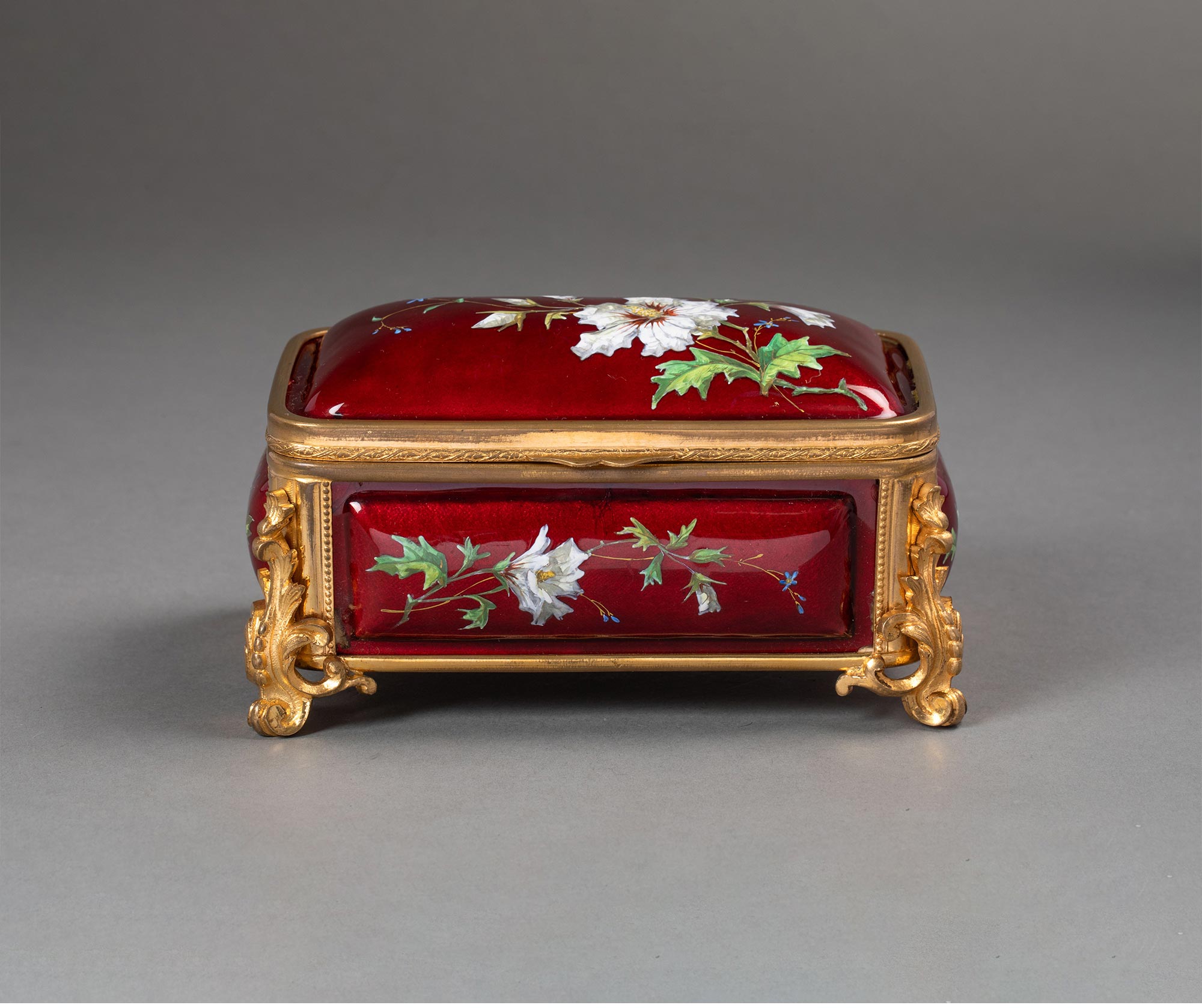 19世纪末法国出品卷叶纹铜鎏金精雕装饰自然花卉主题珐琅彩绘珍宝盒