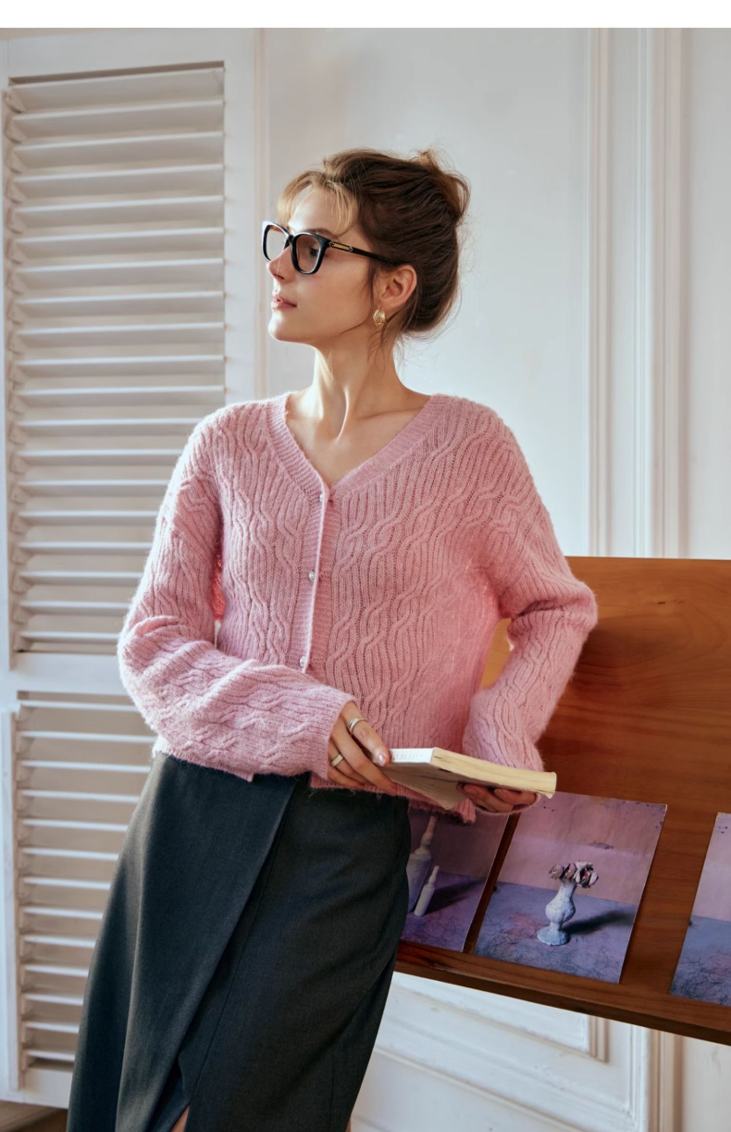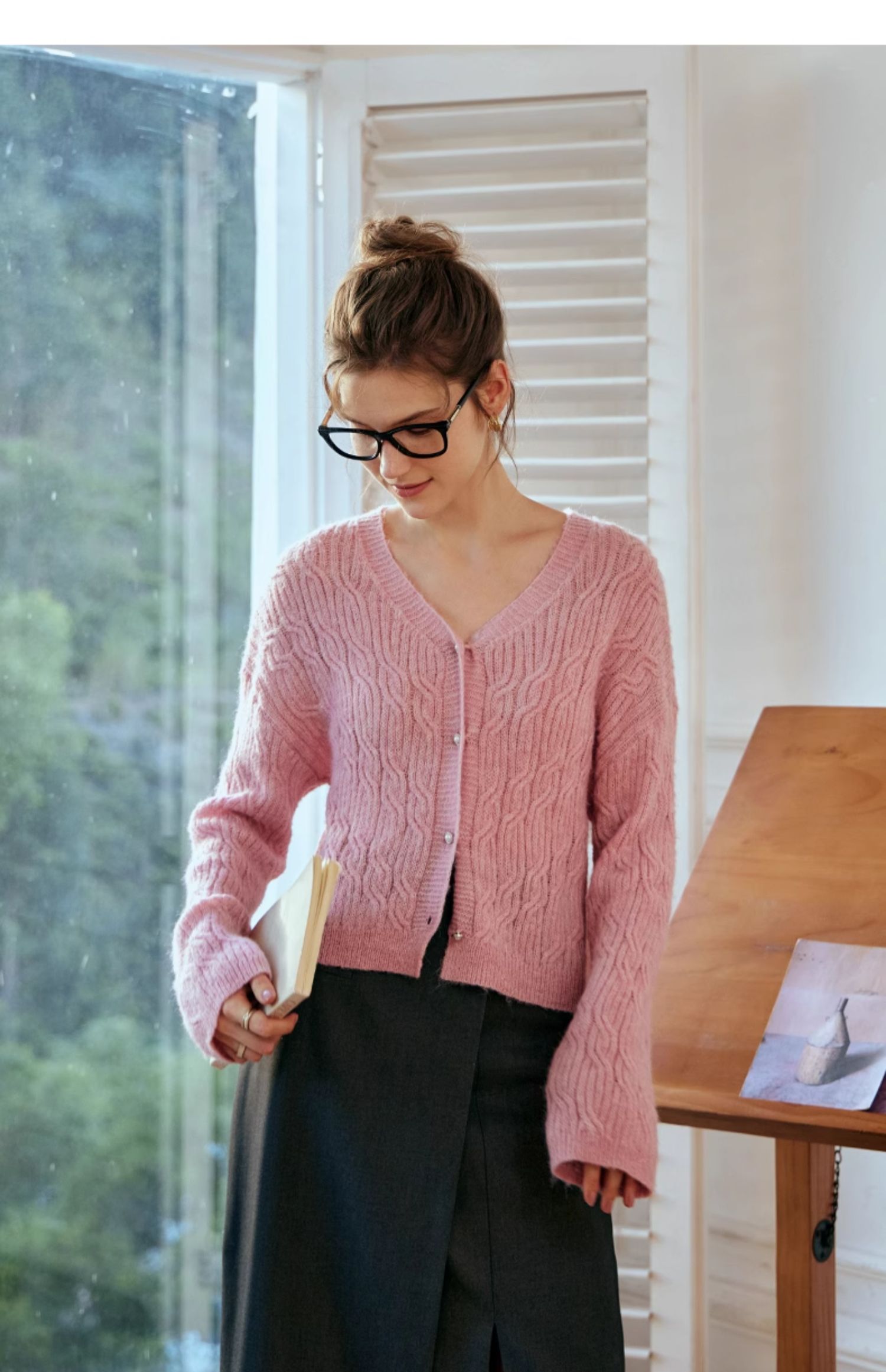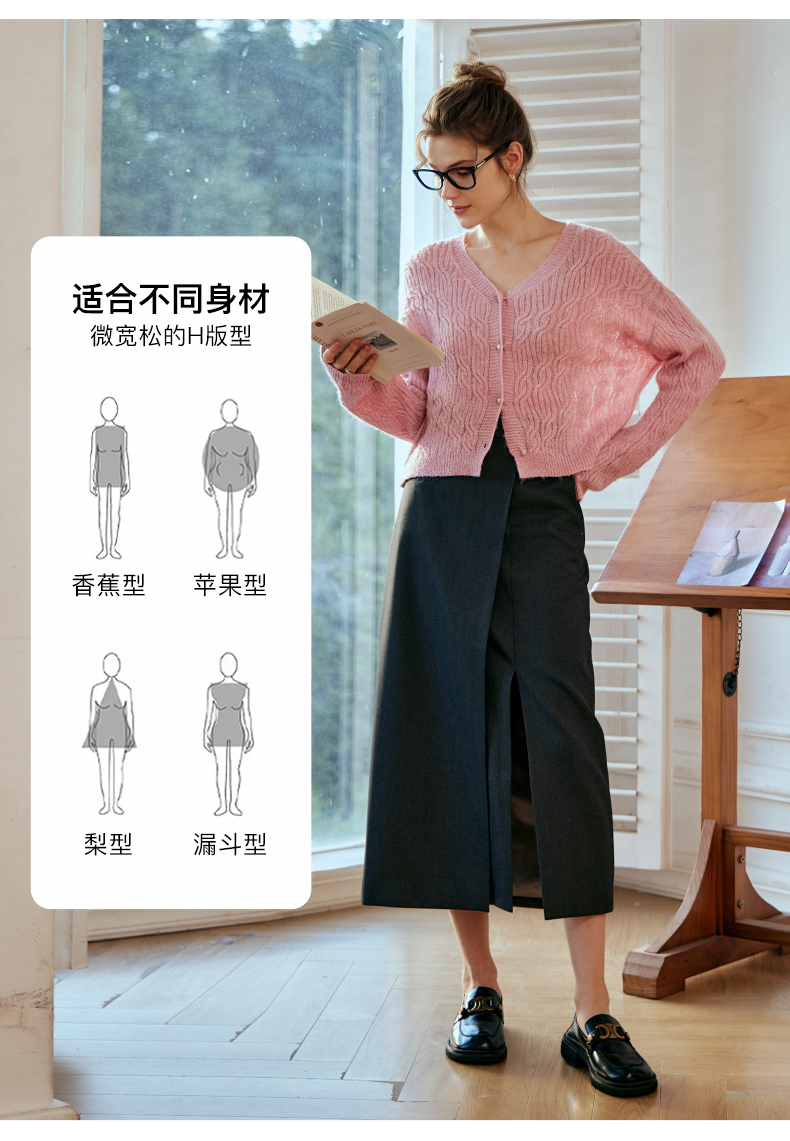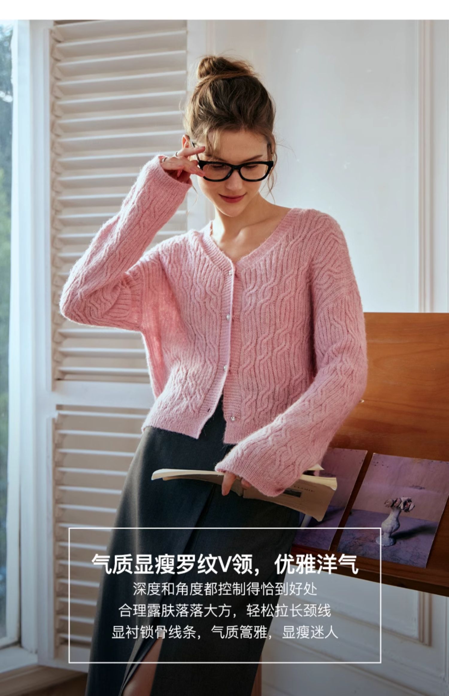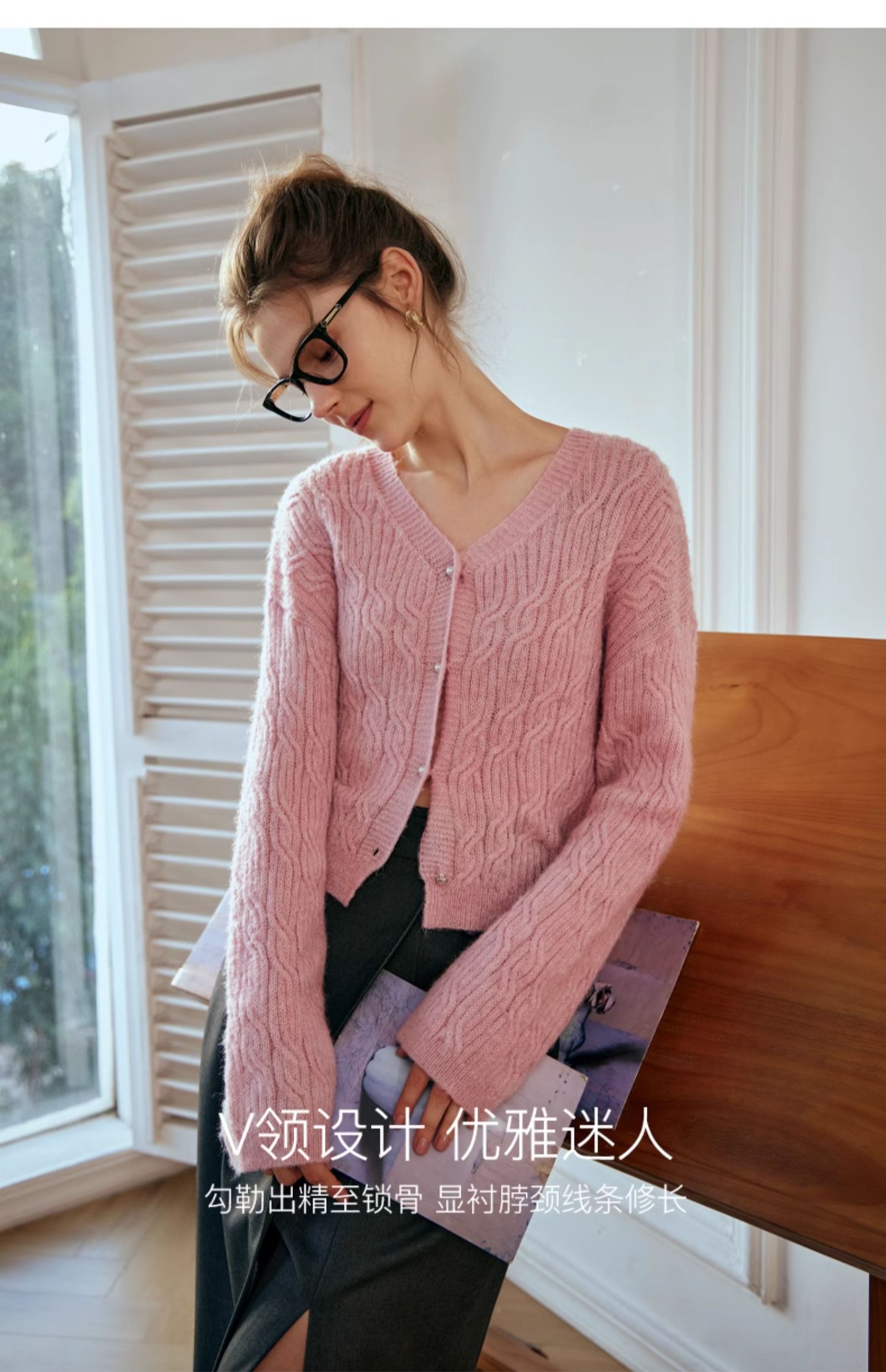 OLrain欧芮儿粉色针织衫女秋冬2023年新款V领绞花薄款开衫外套