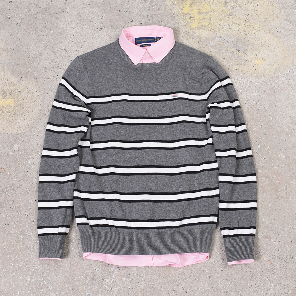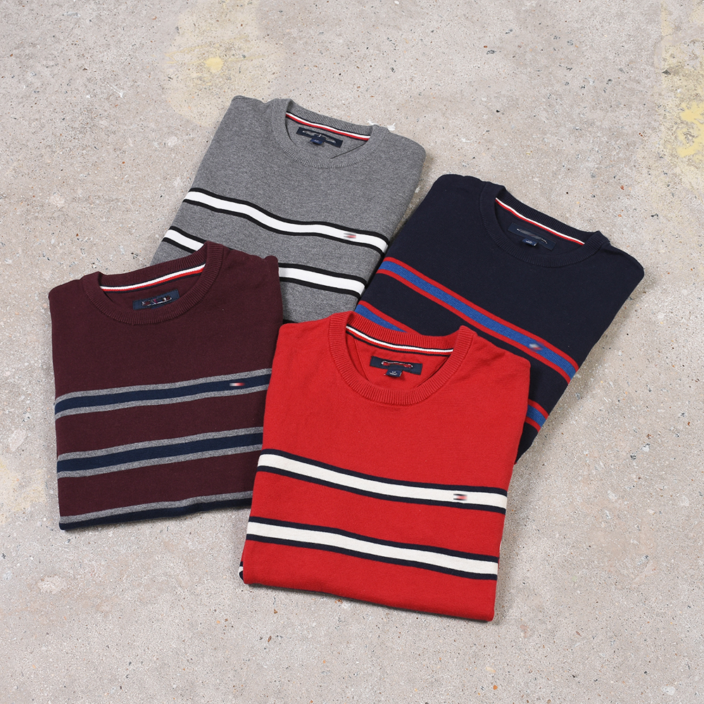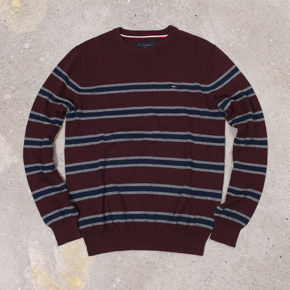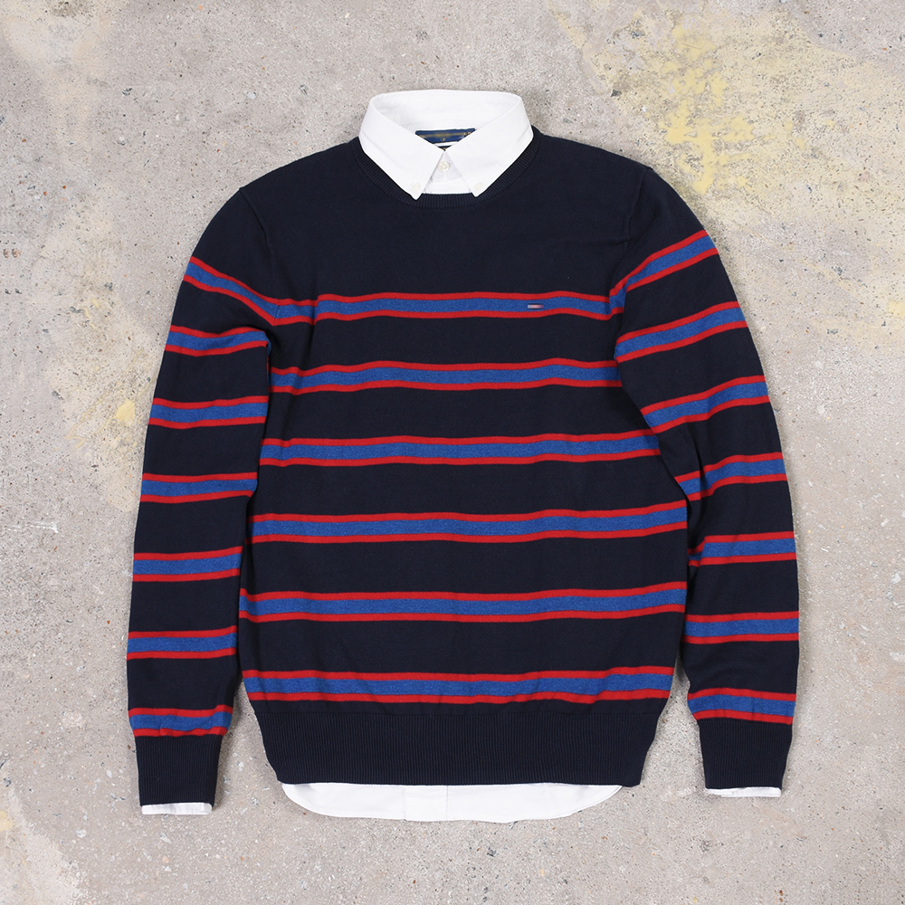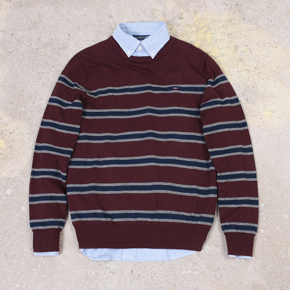 男款条纹撞色圆领毛衣!秋季薄款!部分领标不同,部分码数标错码(按实现尺寸发货),领标剪标或无领标,洗标剪标,棉质面料手感非常舒适!胸前精致刺绣。衬衫百搭!