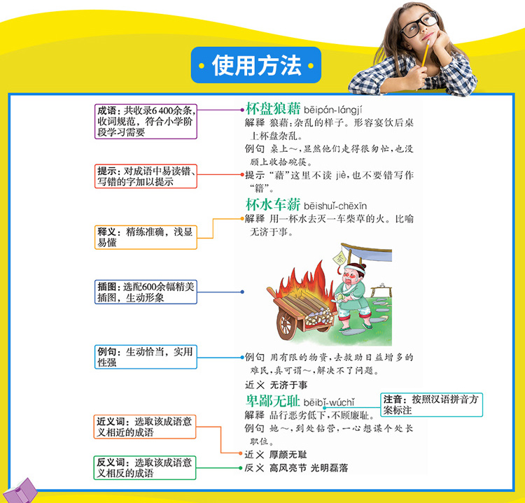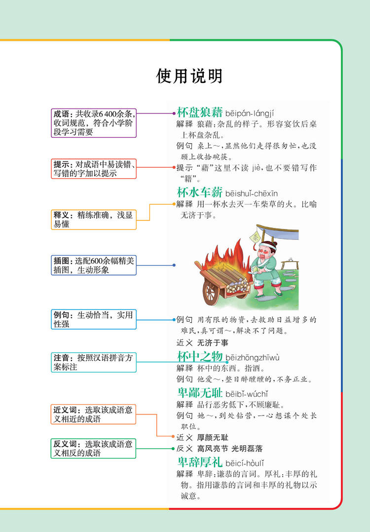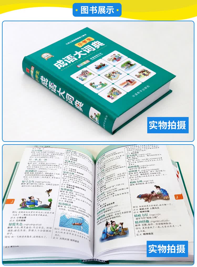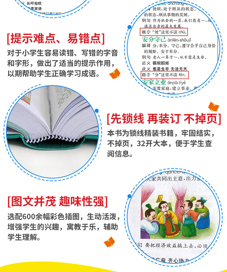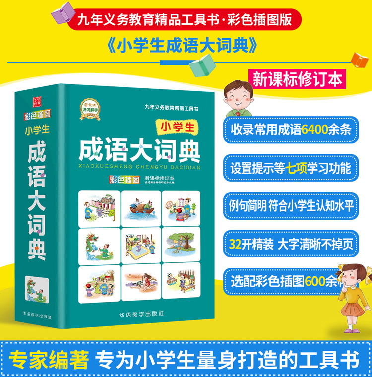 选词规范:按照教育部《义务教育语文课程标准》收录小学阶段需要掌握的成语6400余条。