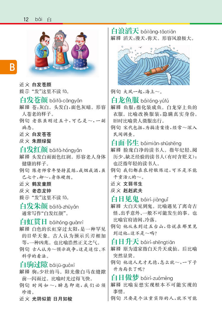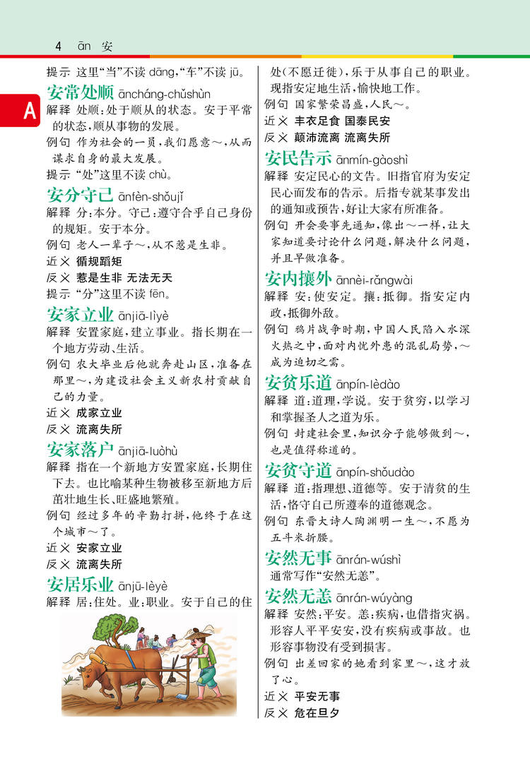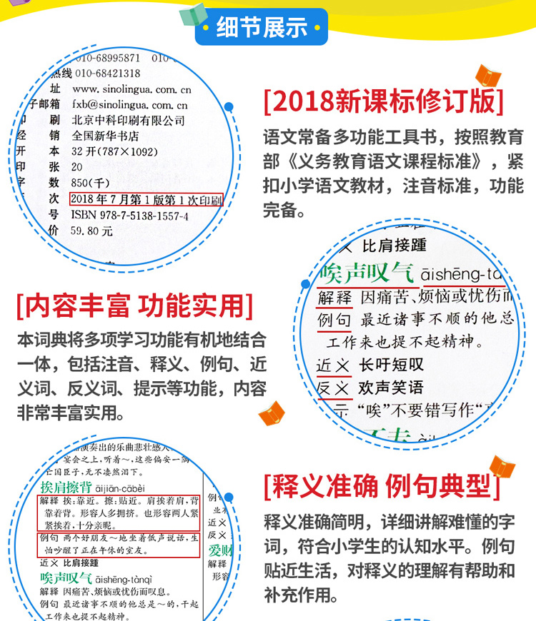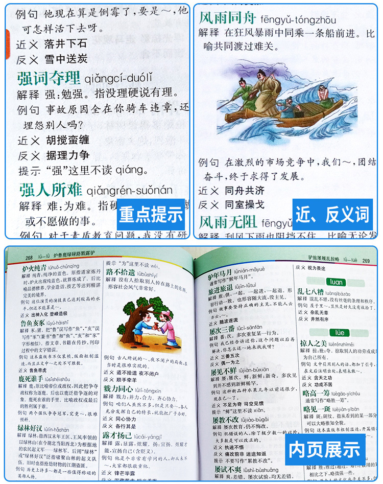 功能完备:设置注音、释义、例句、近义词、反义词、提示等功能。释义准确简明,例句切近生活,符合小学生认知水平。