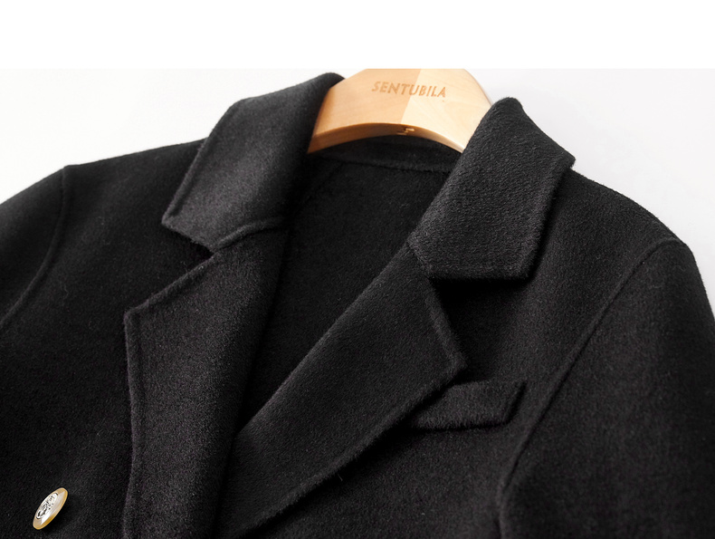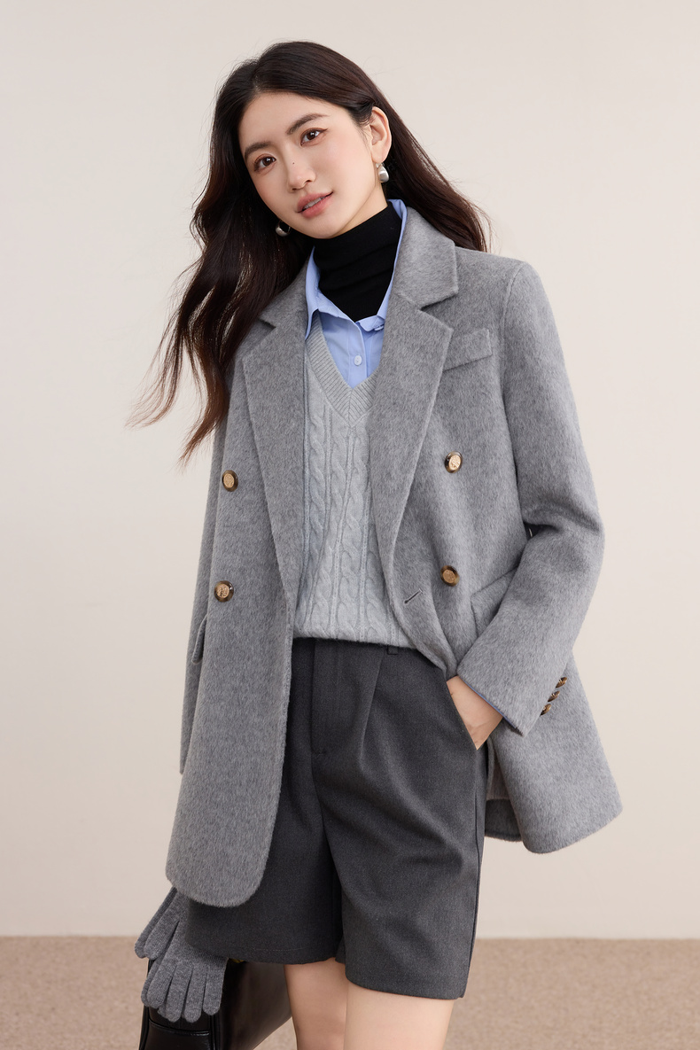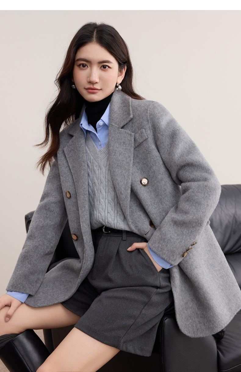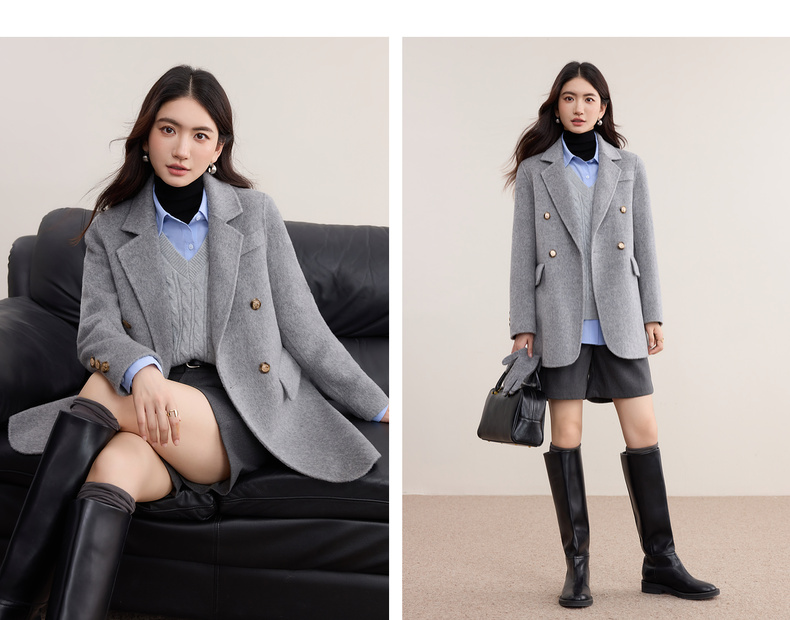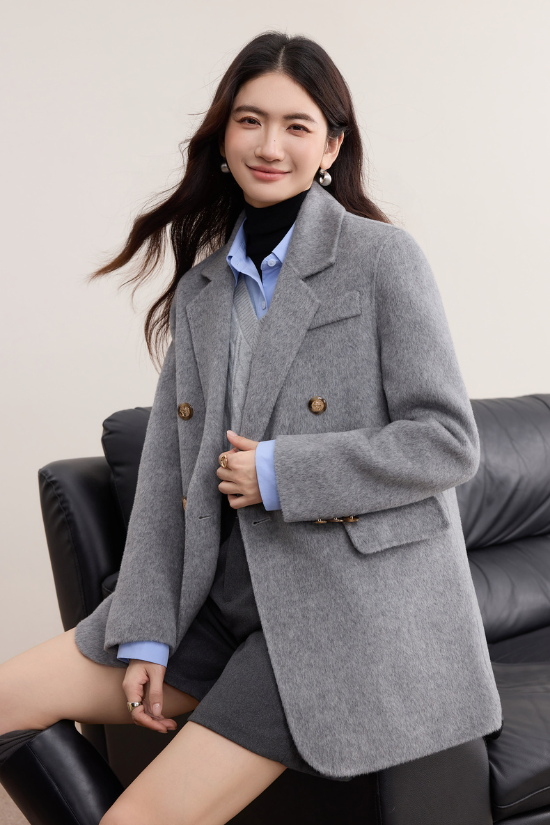 【内购】【100%绵羊毛】英伦风翻领浮雕双排扣长袖袖厚保暖双面呢外套-W54OG3694X