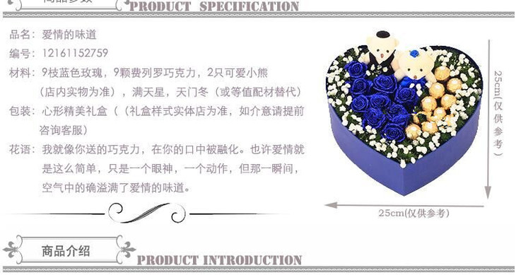 爱情的味道--9枝蓝色玫瑰,9颗费列罗巧克力,2只可爱小熊(店内实物为准),外围满天星,天门冬(或等值配材替代) 心形精美礼盒(1174)