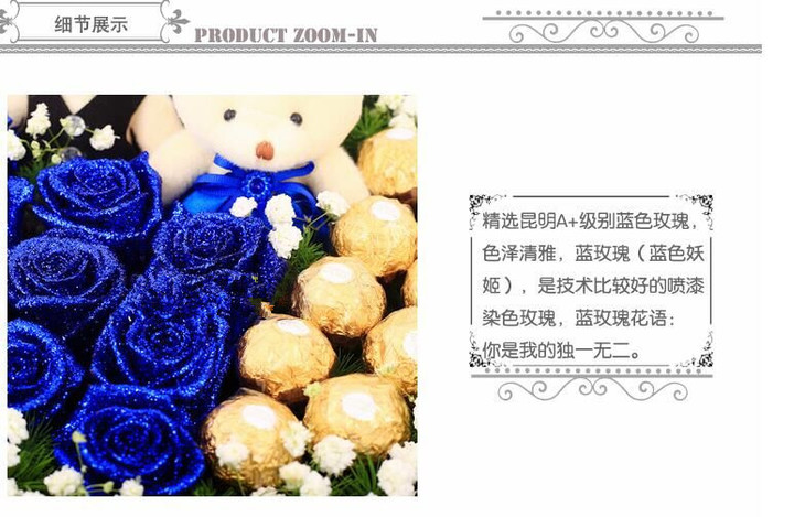 花材:9枝蓝色玫瑰,9颗费列罗巧克力,2只可爱小 熊(店内实物为准),外围满天星,天门冬 (或等值配材替代)