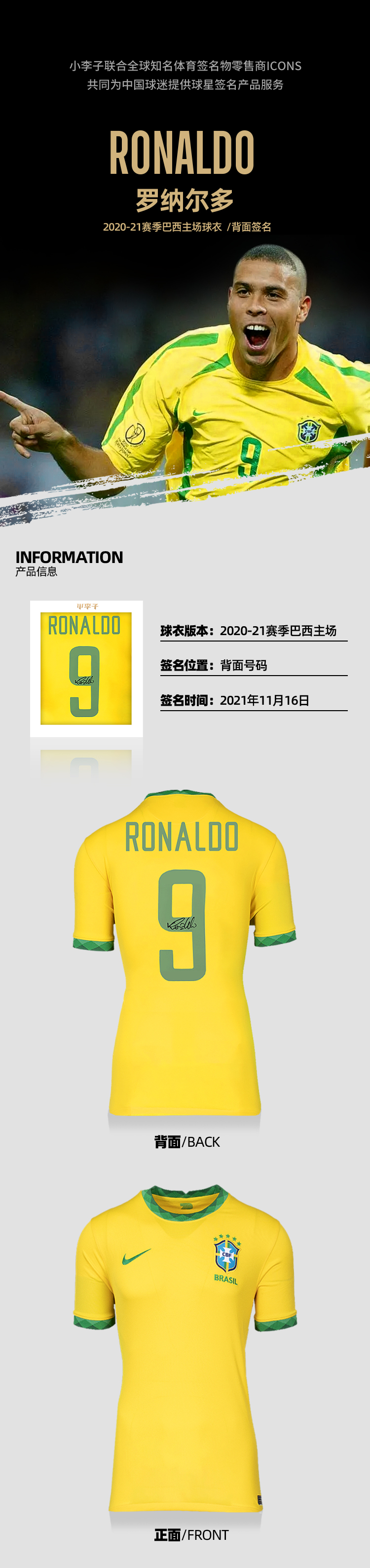 罗纳尔多亲签巴西主场9号球衣大罗签名球衣含证书ICRNBS5