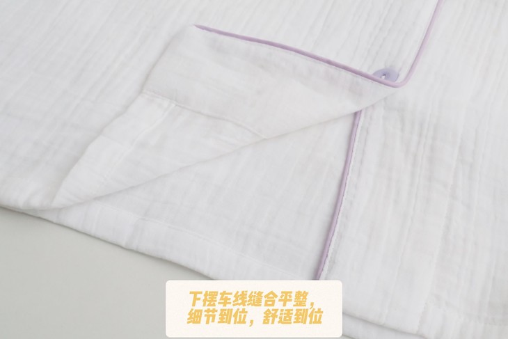 全棉双层纱: 顾名思义就是采用100%棉花制成的2层纱布面料 制作双层纱时,在纺织过程中每隔2cm 就用一根纱线将2成纱布交织链接在一起 超柔高支织造:紧密链接,不易变形、位移‼
