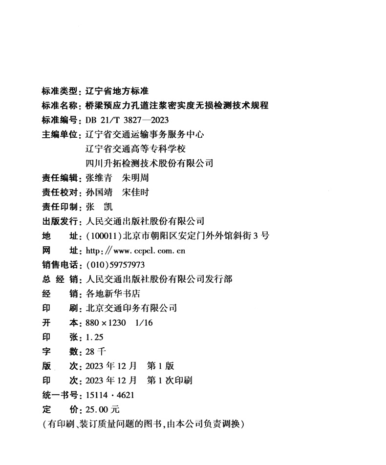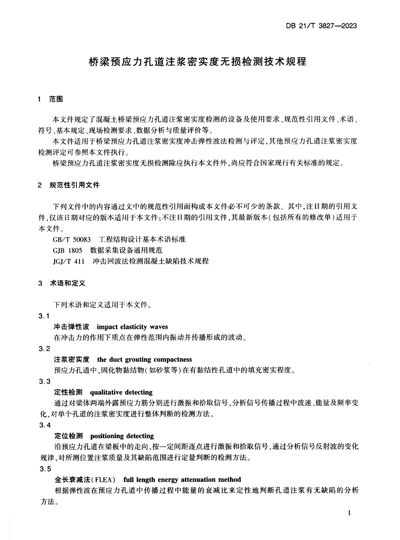 书名:桥梁预应力孔道注浆密实度无损检测技术规程(DB 21/T 3827—2023)