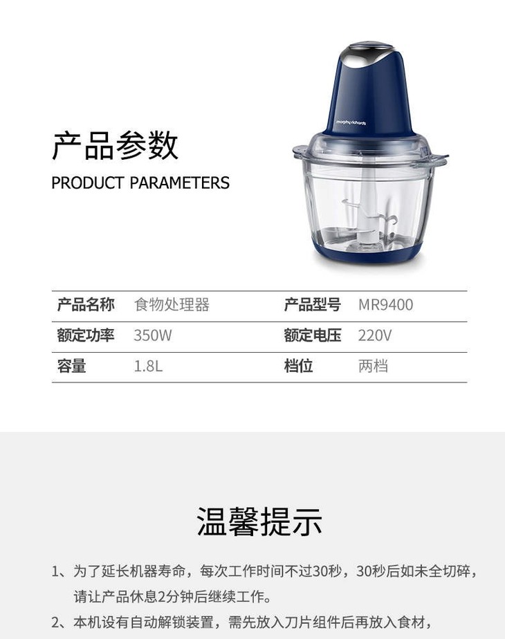 【一般贸易】MORPHY/摩飞绞肉机MR9400食物处理器