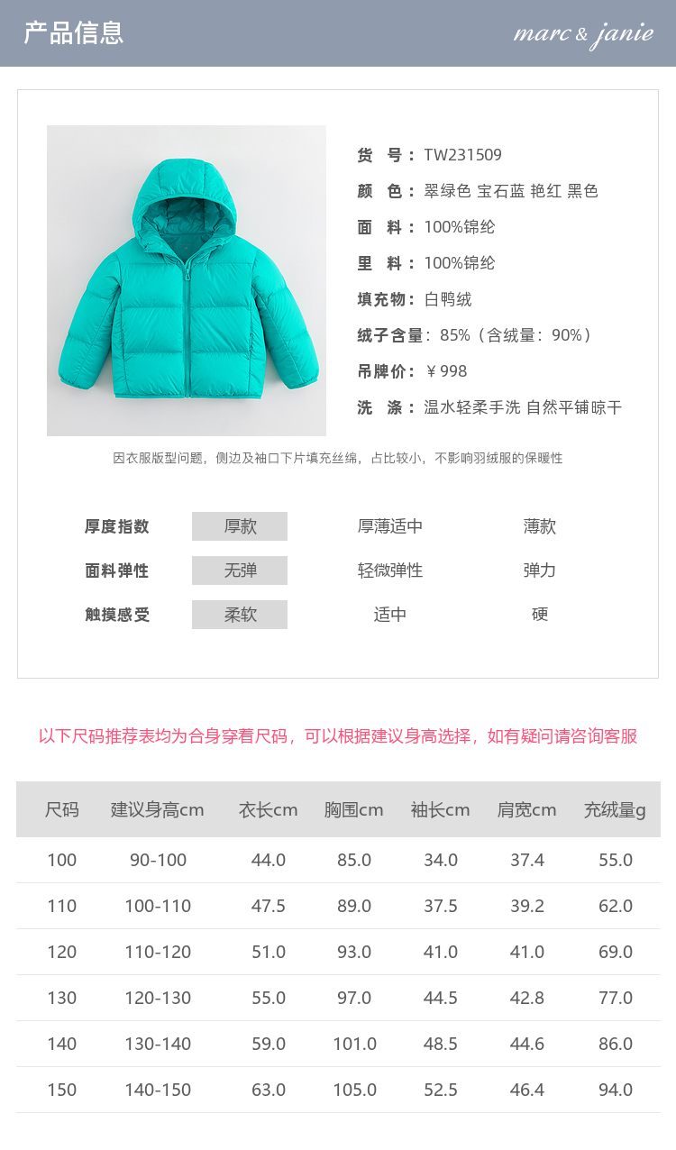 【三防】马克珍妮男童女童超轻加厚羽绒服 儿童冬装羽绒服231509