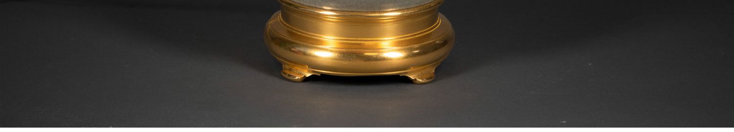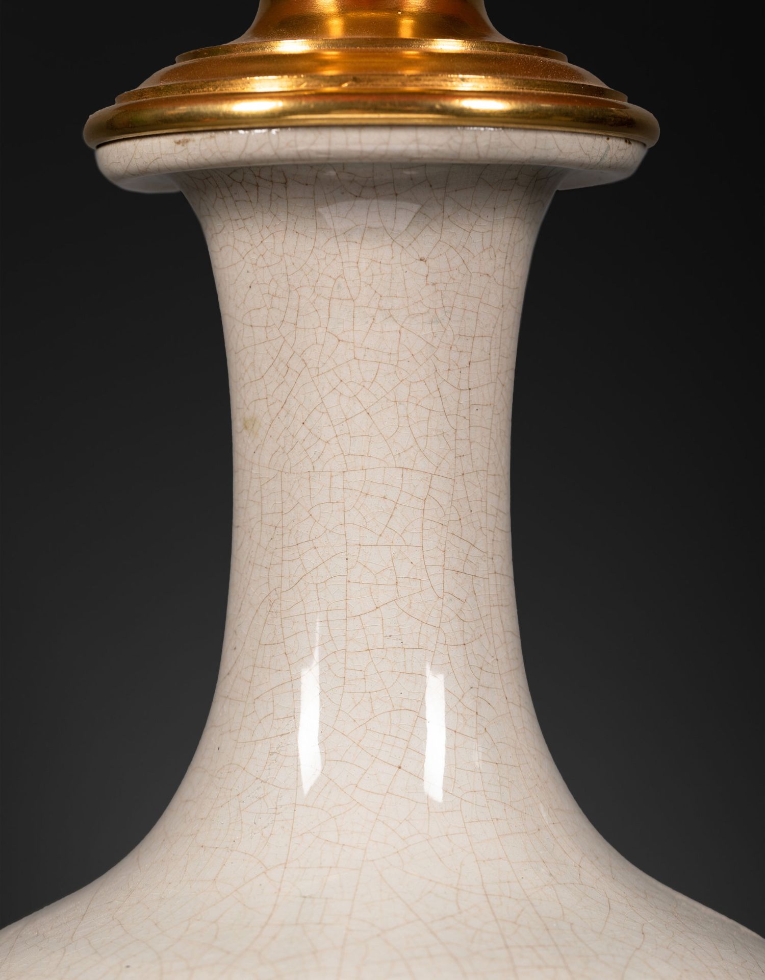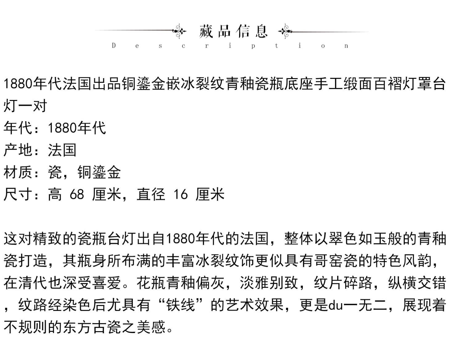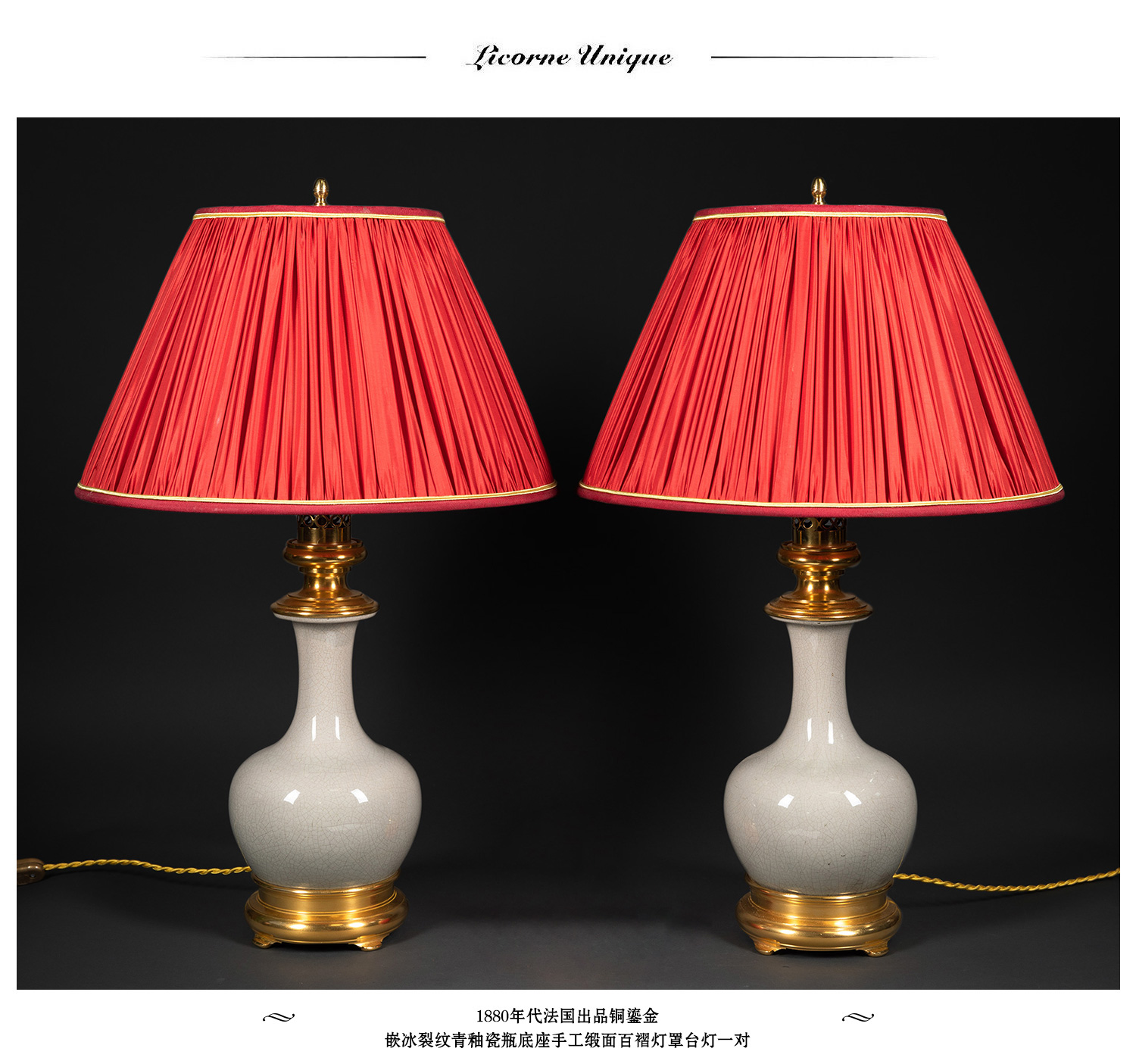 独角鹿西洋古董铜鎏金嵌冰裂纹青釉瓷瓶手工缎面百褶灯罩台灯一对