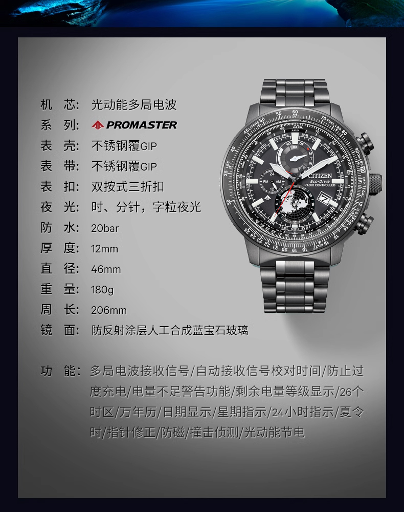 西铁城/CITIZEN不锈钢覆GIP光动能万年历 电波男表BY3005-56G
