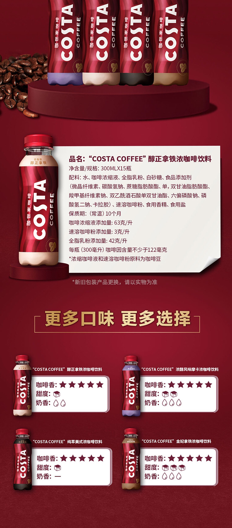 COSTA COFFEE醇正拿铁咖啡饮料 300ml*15瓶/件