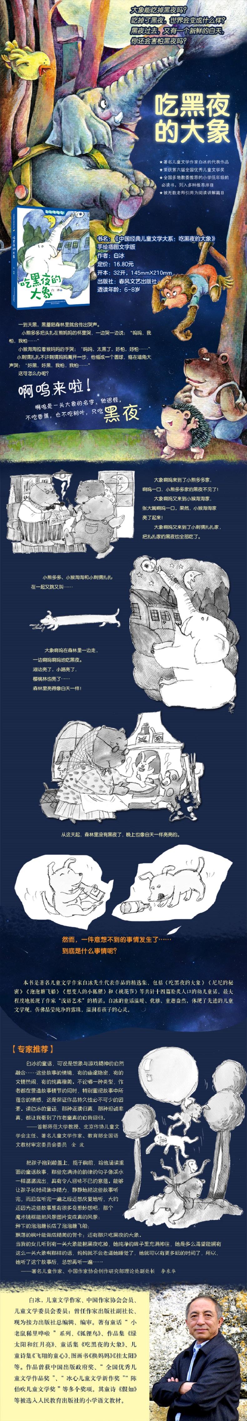 黑蘑菇森林里的小动物们害怕黑夜,一到天黑,森林里就传出呜呜的哭声。这时来了一头名叫啊呜的大象,啊呜啊呜地把黑夜全吃进肚里去了,森林亮得像白天一样。结果,小动物们晚上都不睡觉了,白天又哈欠连天,黑蘑菇森林变成了讨厌的哈欠森林。吃黑夜的大象只好把黑夜全吐了出来,森林又恢复了正常,小动物们终于安睡了。故事用奇妙的想象、浅显的生活语言,带给怕黑的孩子们温暖的安抚。白冰的童话体现了先进的儿童文学观和儿童教育观,仿佛是有魔力的笛声,温润着孩子的心灵。