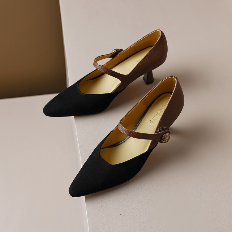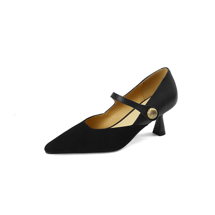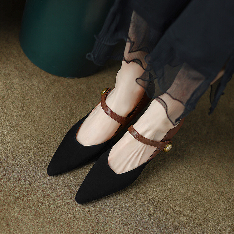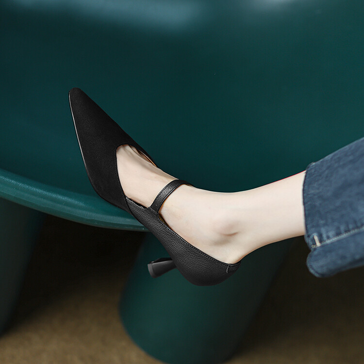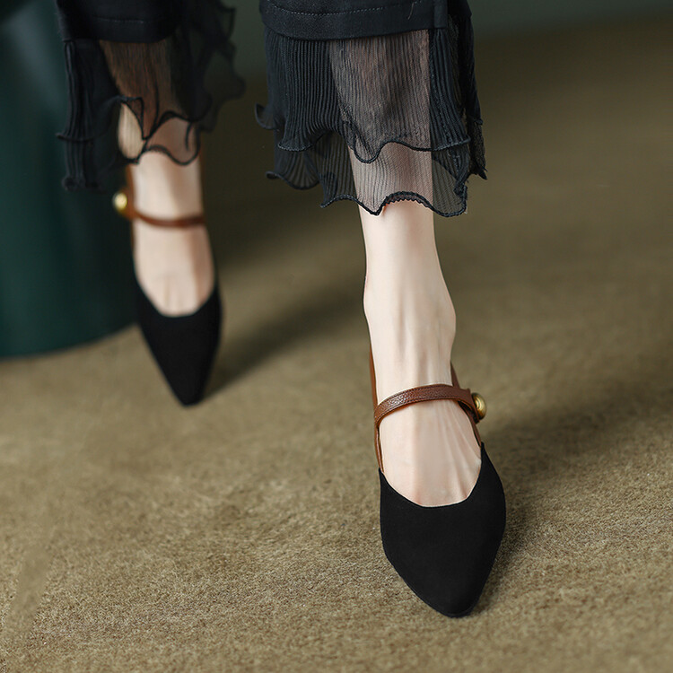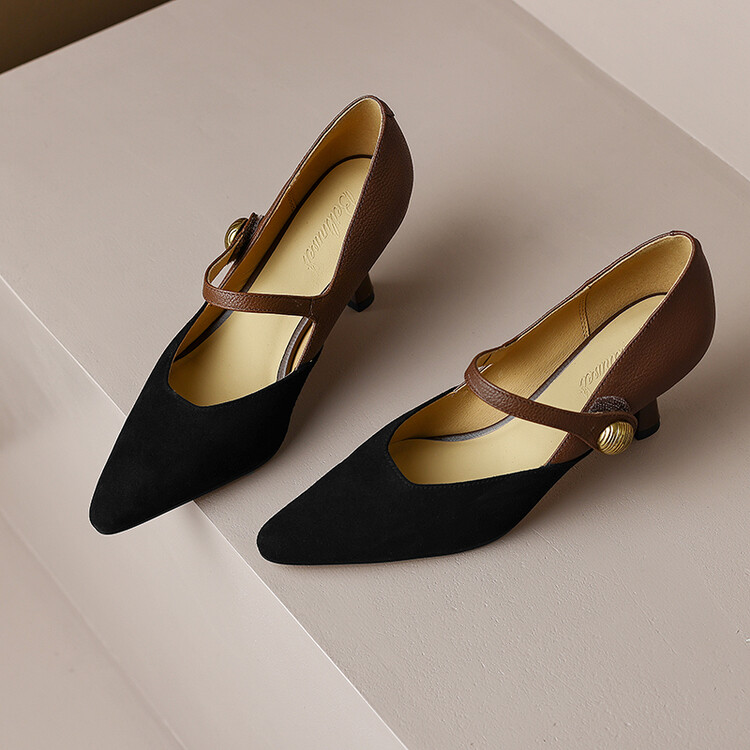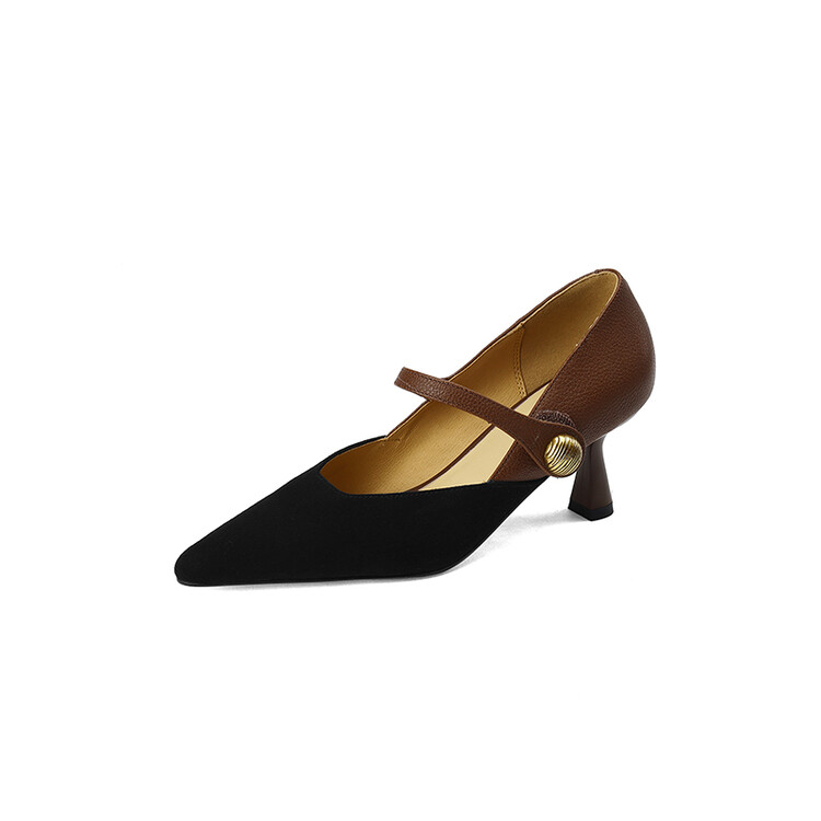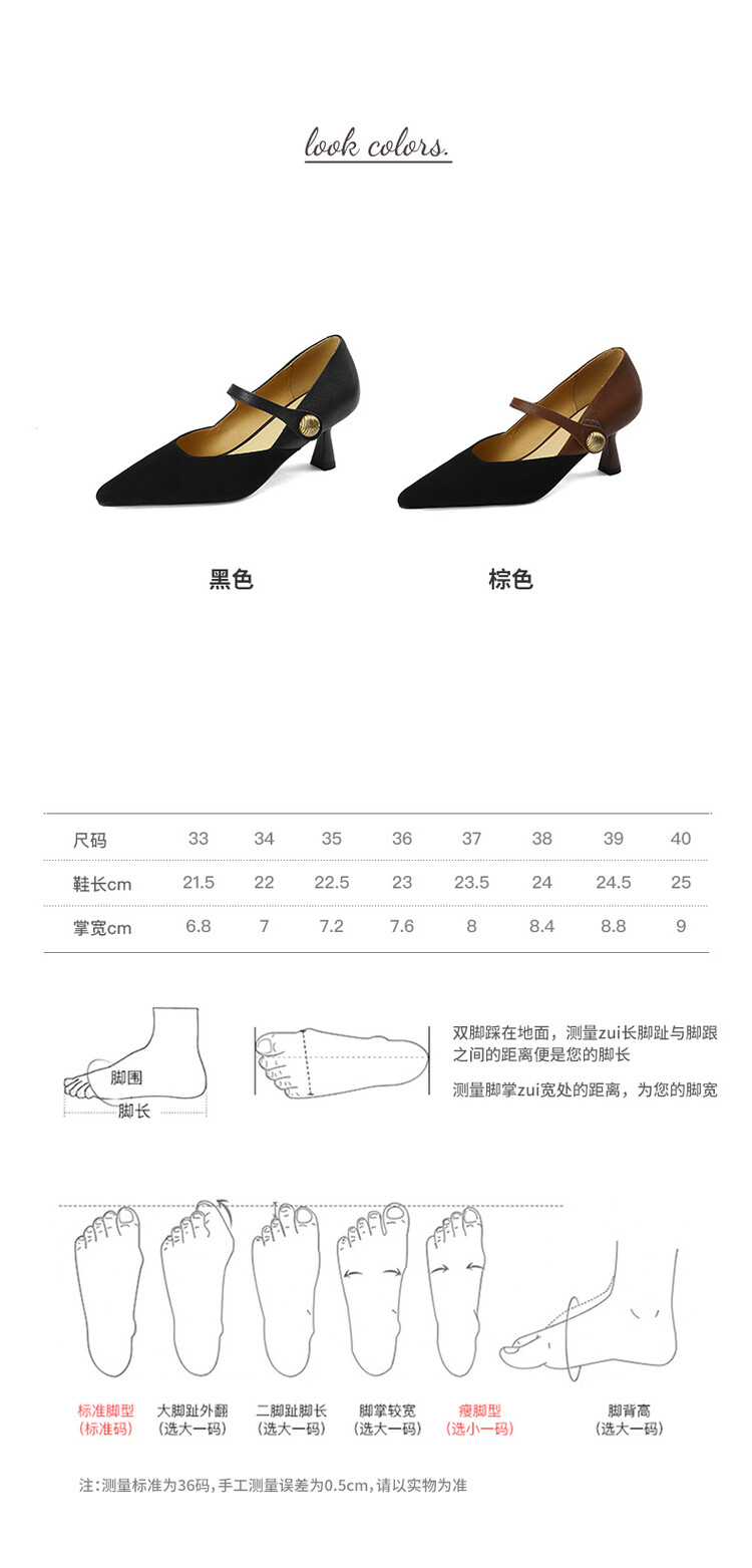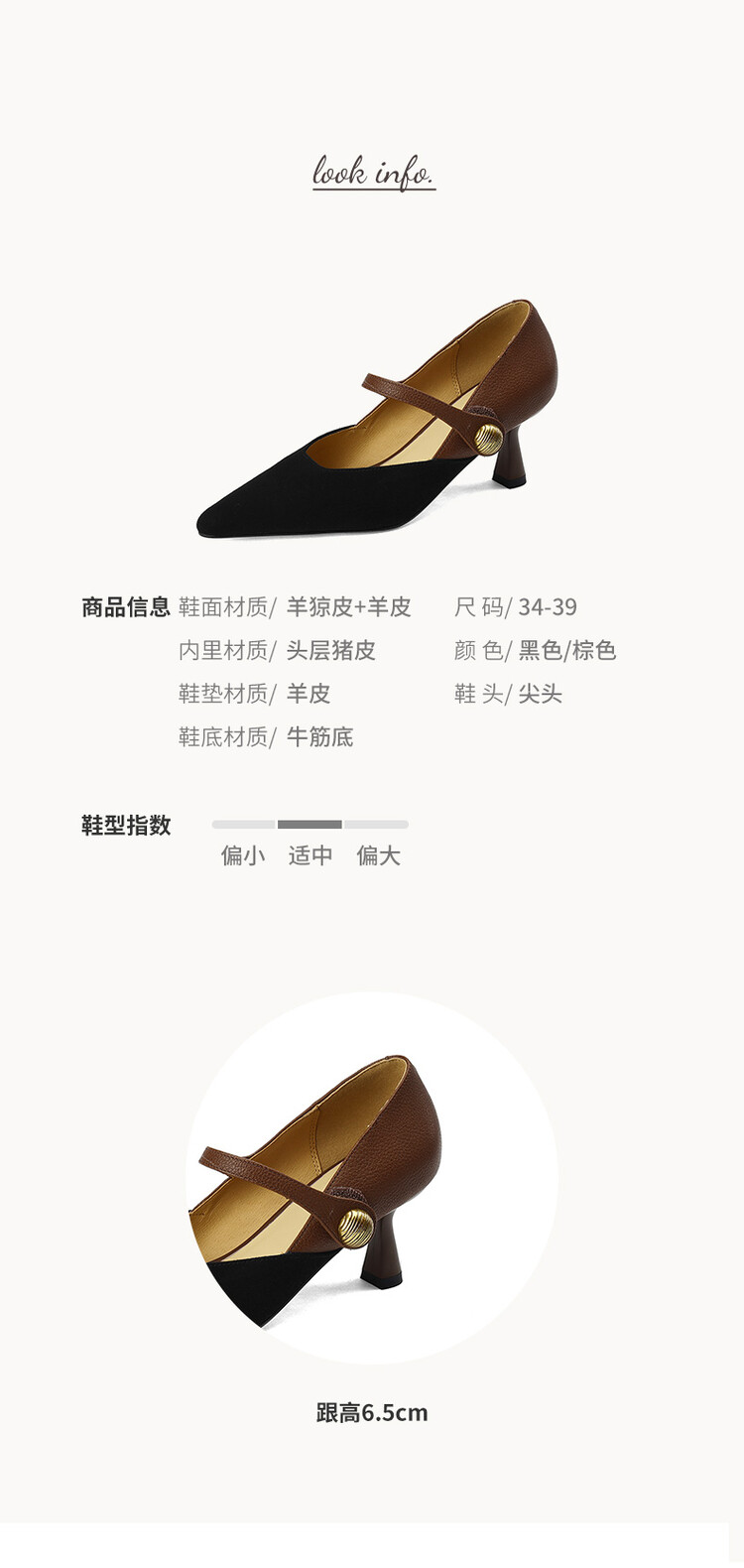 【货号】ZF051D【帮面材质】羊皮+羊猄皮【内里材质】头层猪皮【鞋垫材质】羊皮【鞋底材质】牛筋底【颜色】黑色 棕色【跟高】6.5CM【掌宽】8CM【尺码】34-39