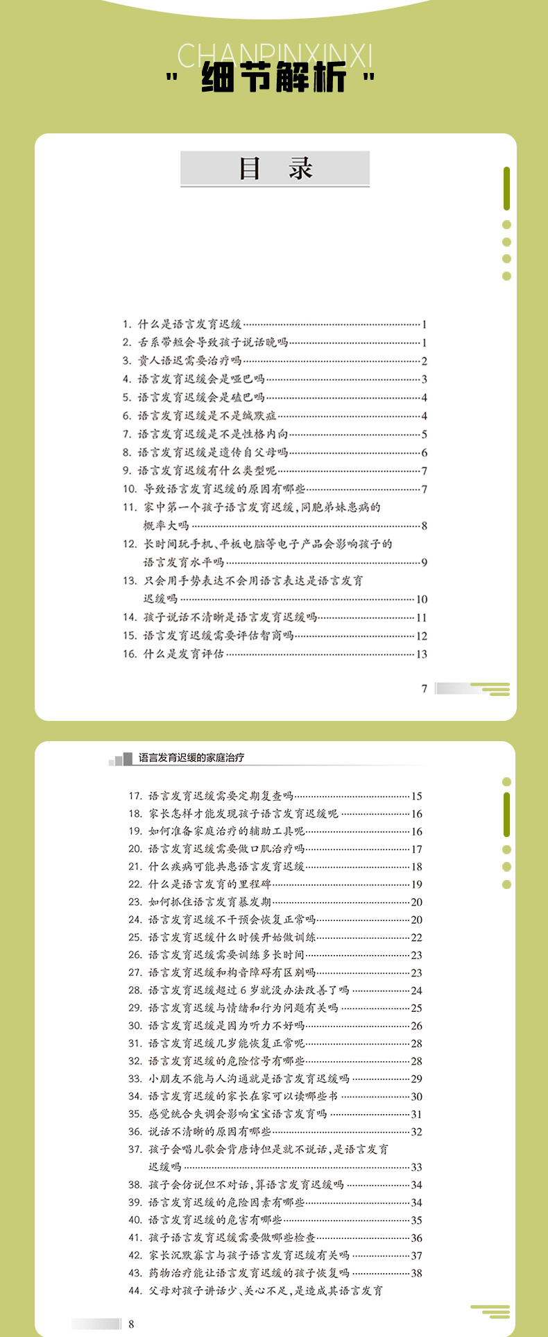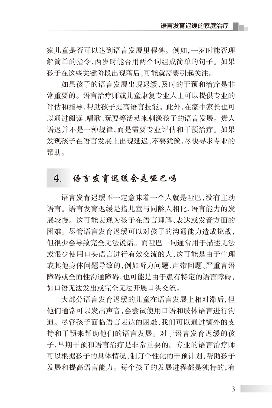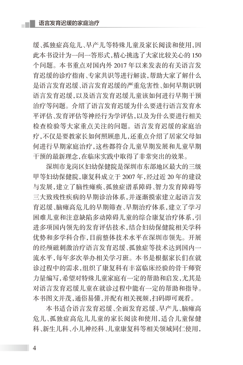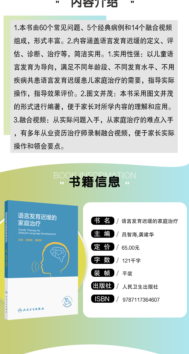 1.本书由60个常见问题、5个经典病例和14个融合视频组成,形式丰富。2.内容涵盖语言发育迟缓的定义、评估、诊断、治疗等,简洁实用。1.实用性强:以儿童语言发育为导向,满足不同年龄段、不同发育水平、不用疾病共患语言发育迟缓患儿家庭治疗的需要,指导实际操作,指导效果评价。2.图文并茂:本书采用图文并茂的形式进行编著,便于家长对所学内容的理解和应用。3.融合视频:从实际问题入手,从家庭治疗的难点入手,有多年从业资历治疗师录制融合视频,便于家长实际操作和领会要点。