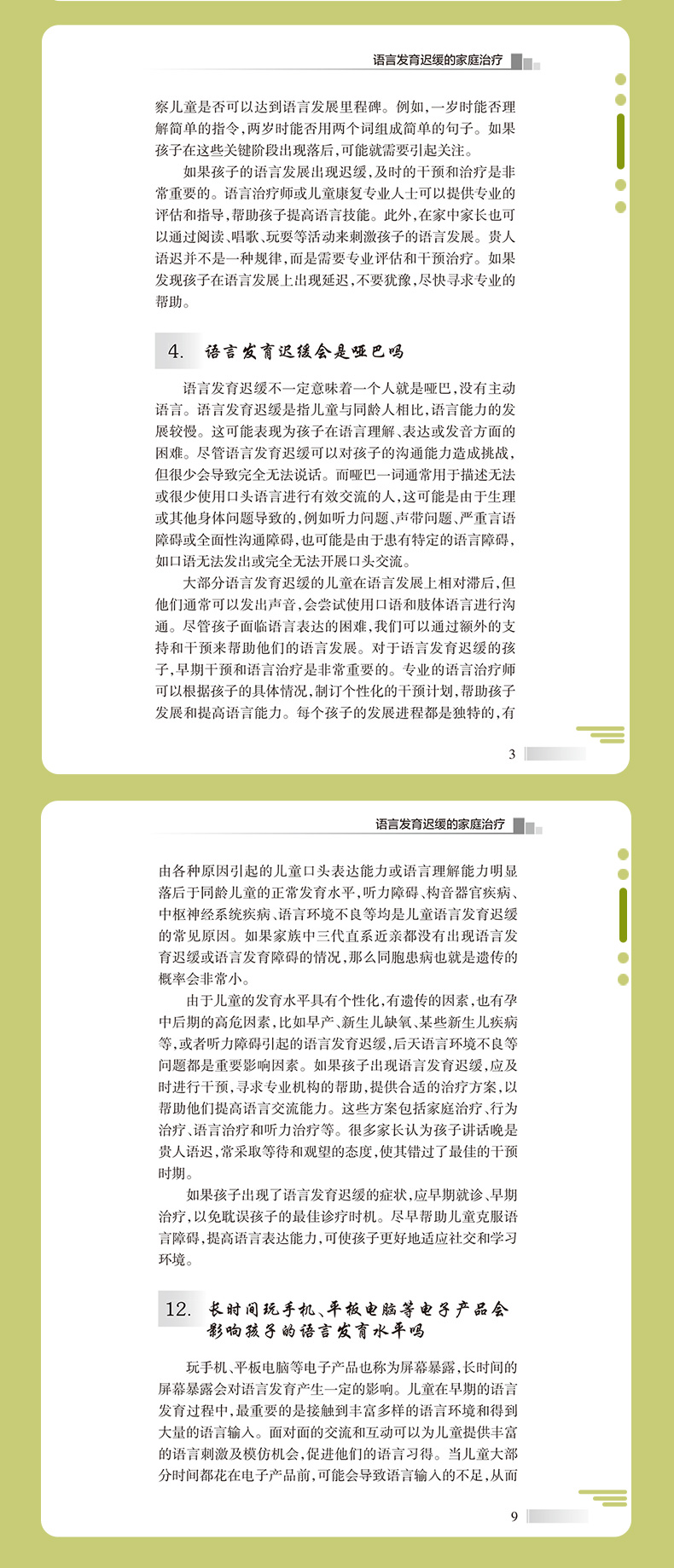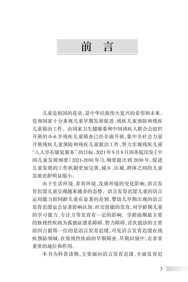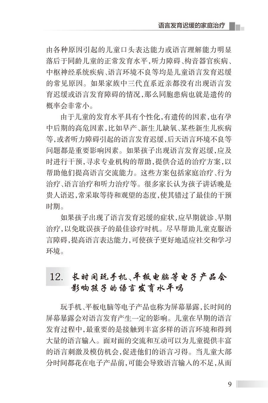 1.本书由60个常见问题、5个经典病例和14个融合视频组成,形式丰富。2.内容涵盖语言发育迟缓的定义、评估、诊断、治疗等,简洁实用。1.实用性强:以儿童语言发育为导向,满足不同年龄段、不同发育水平、不用疾病共患语言发育迟缓患儿家庭治疗的需要,指导实际操作,指导效果评价。2.图文并茂:本书采用图文并茂的形式进行编著,便于家长对所学内容的理解和应用。3.融合视频:从实际问题入手,从家庭治疗的难点入手,有多年从业资历治疗师录制融合视频,便于家长实际操作和领会要点。
