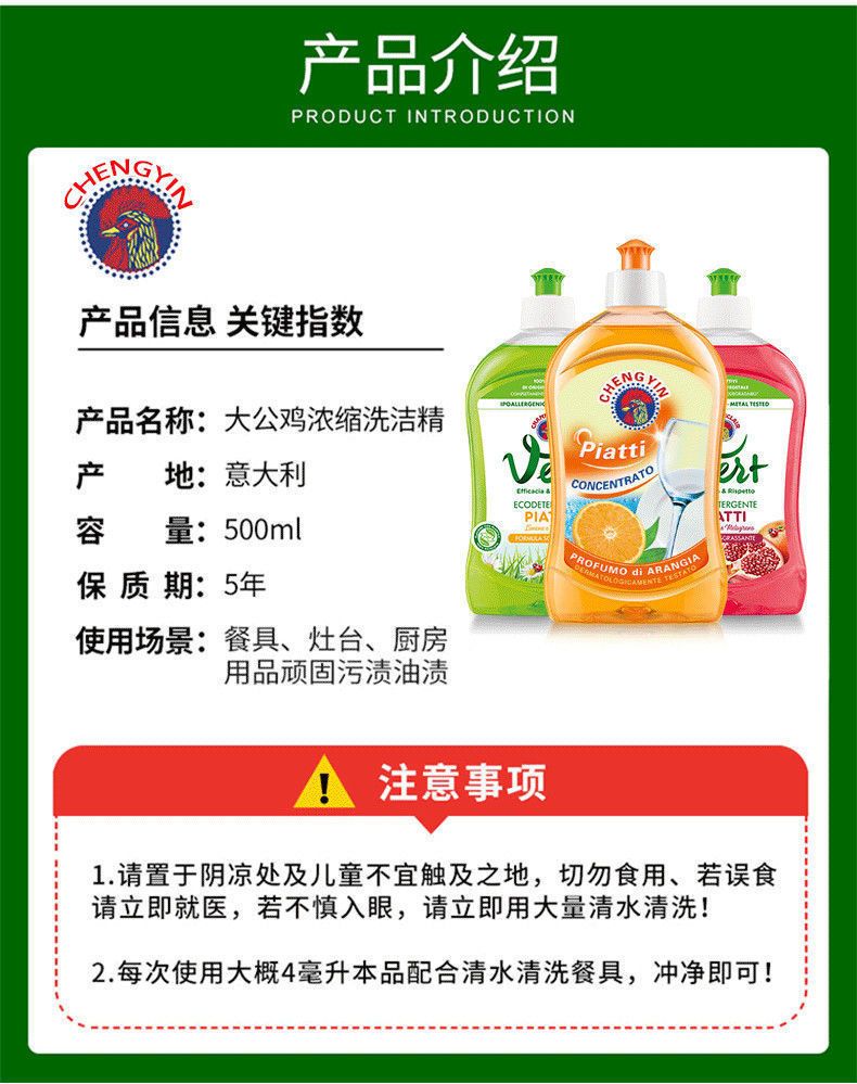 【爆款超低价预售 急单慎拍】意大利进口公鸡头洗洁精浓缩食品级温和去油不伤手餐具果蔬家庭装