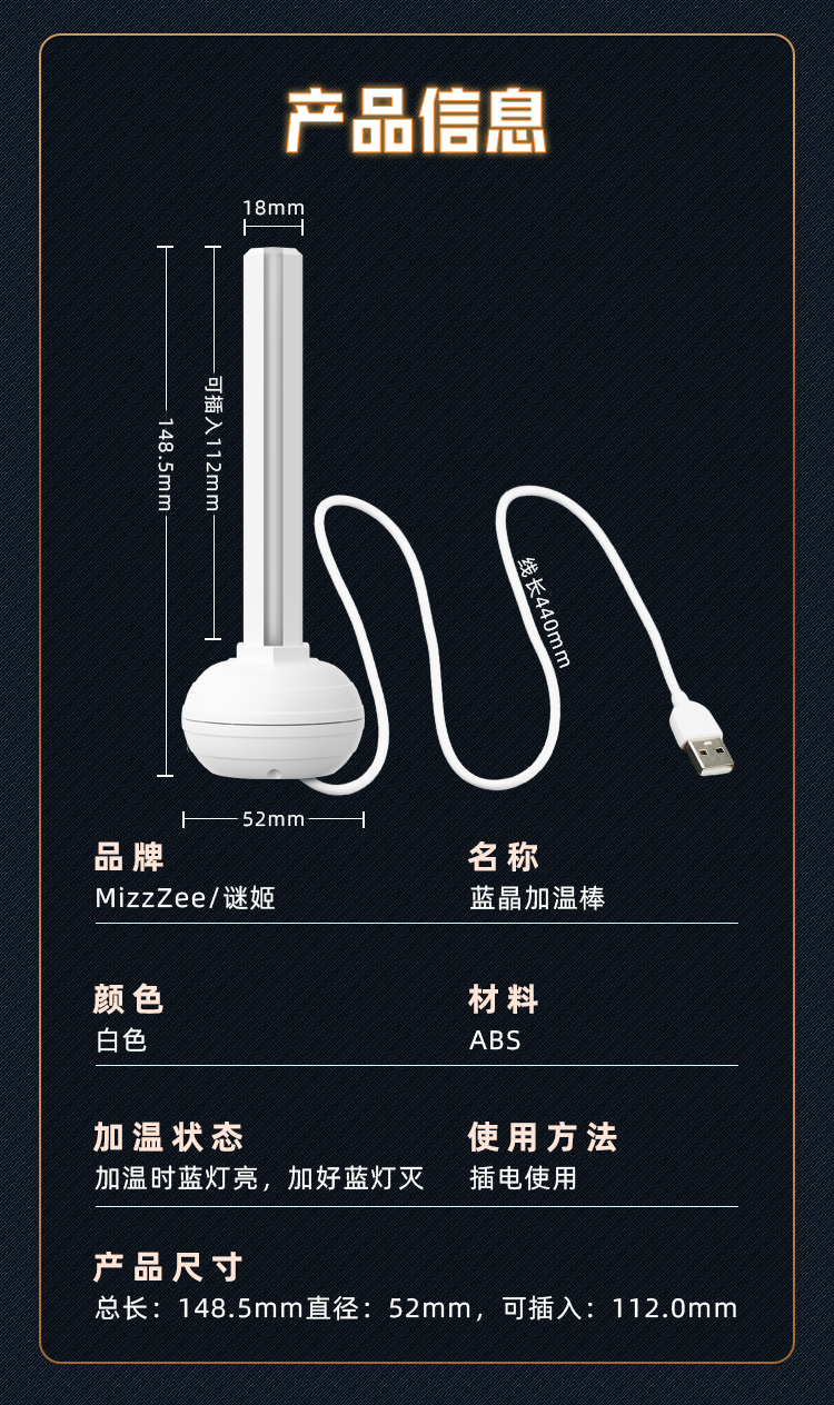 谜姬 高级恒温飞机杯usb蓝晶加热棒 名器倒模抽插加热器加温棒