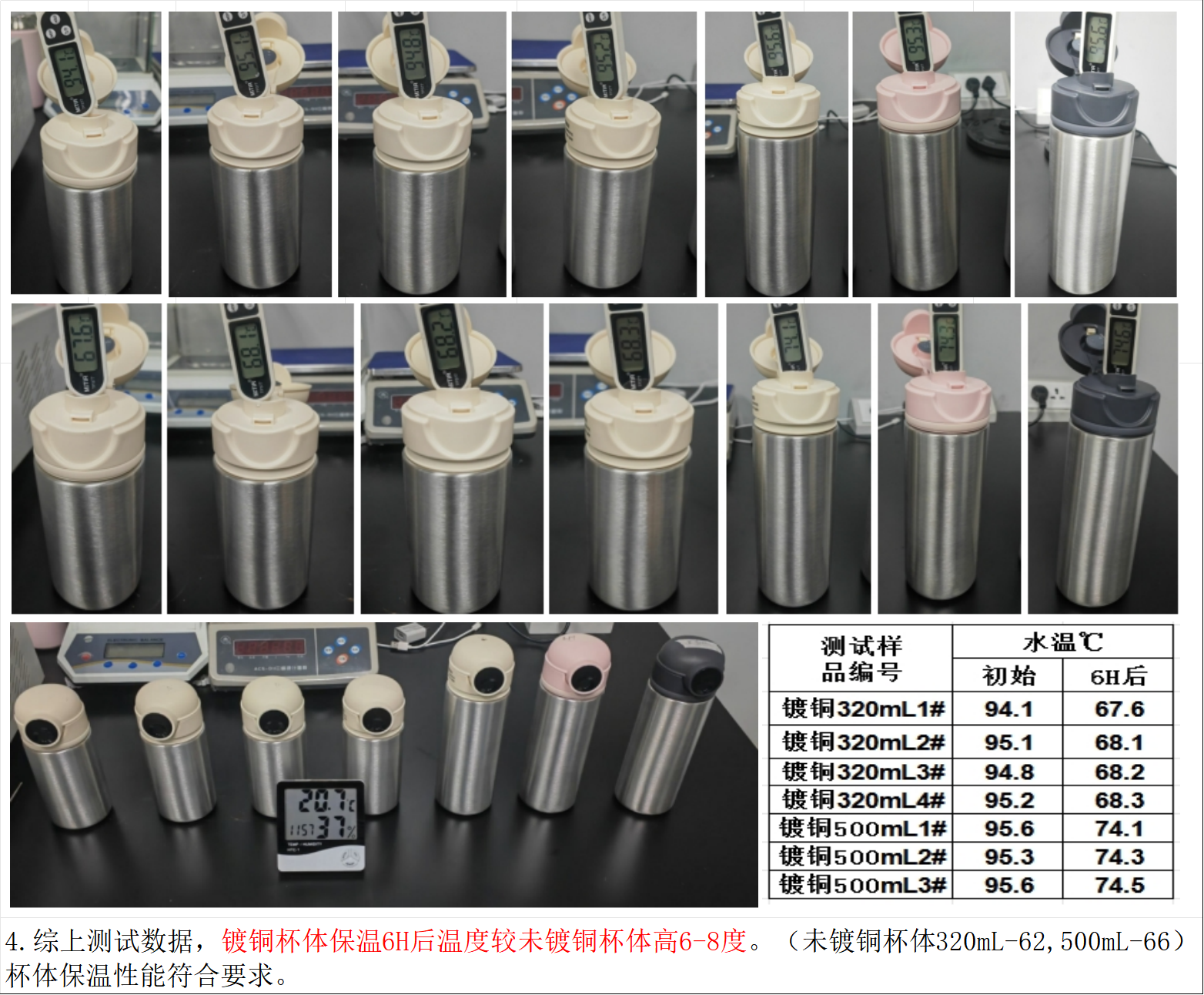 ✅️镀铜杯体,达到更长效保温效果! 实测在室温20℃环境下,95℃的水6小时水温能维持约74℃!普通杯身仅能维持在66℃左右!升级款镀铜杯体保温6H后温度较未镀铜杯体高6-8度!保温效果更好,一整天都有热水喝