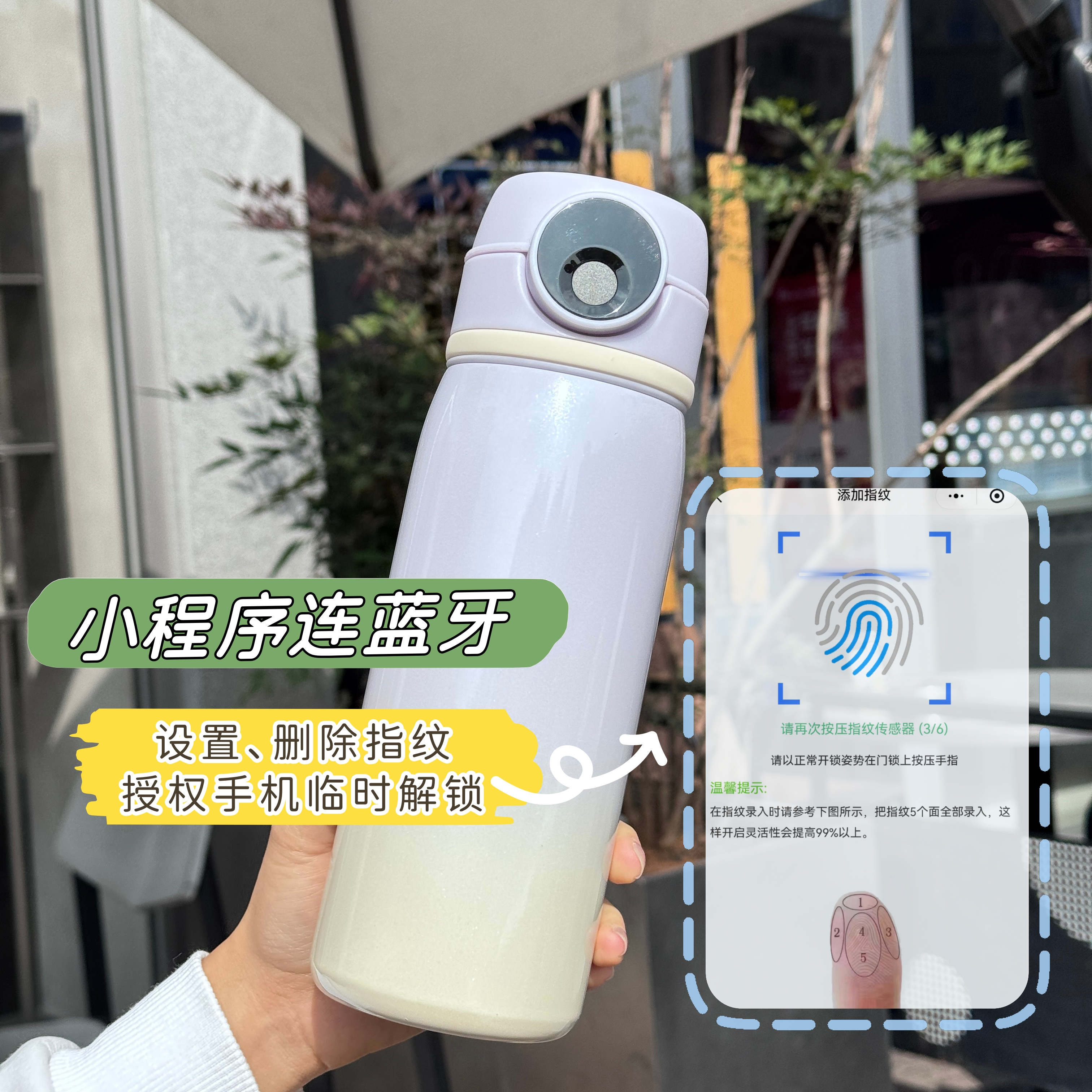 市场上的指纹水杯,良莠不齐!不乏很多以次充好的!不对比普通家长很难知道其中的道道.... 💥全新升级智能蓝牙『mixwell智能指纹水杯』 ✅️0.2秒指纹识别,潮湿、低温依然稳定识别。解锁杯盖自动弹出,单手操作饮水。 ✅️支持小程序连接蓝牙进行指纹管理、一键删除指纹、一键解锁杯盖、临时授权解锁、电量可视等! ✅️最高可支持15枚指纹录入,全家人的指纹都能录! ✅️Type-C通用接口充电,超长续航2周+。 ✅️母婴级316不锈钢内胆,食品级PCTG杯盖,比304更抗腐蚀耐高温,装果汁、牛奶这些都不怕! ✅️亲肤钢琴烤漆渐变杯身,渐变颜色,抓握舒适、防滑,外观时尚漂亮。 ✅️IPX7级整杯身防水,和苹果华为手机同级别!可冲洗! ✅️增加水杯手提带扣环,可以DIY配件,增加实用性! ✅️镀铜杯身,更长效保温!让孩子一整天都有热水喝!