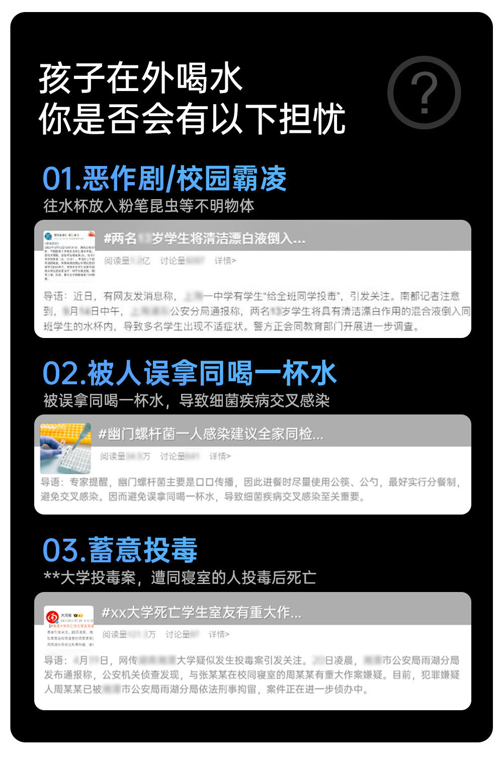 网上校园饮水安全事故报道屡见不鲜:水杯被同学恶作剧投橡皮、强碱水、漂白剂、图钉等,因此导致重伤、残疾或者身亡! 你一定需要一个能解决家长关于孩子校园饮水安全忧虑问题杯子!