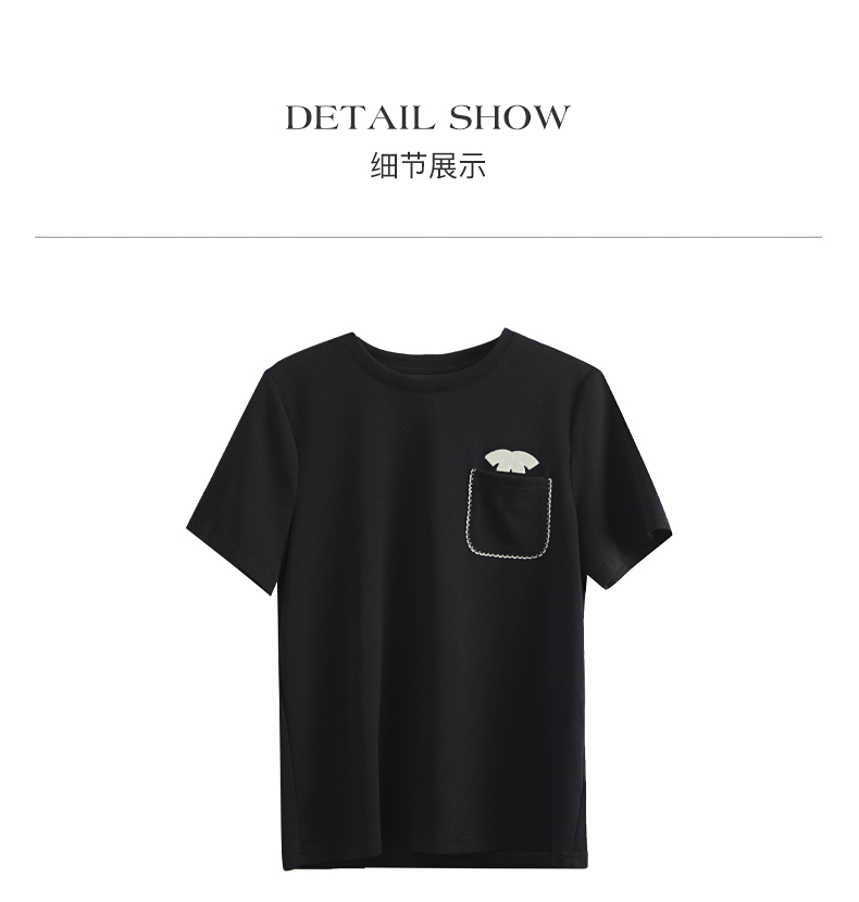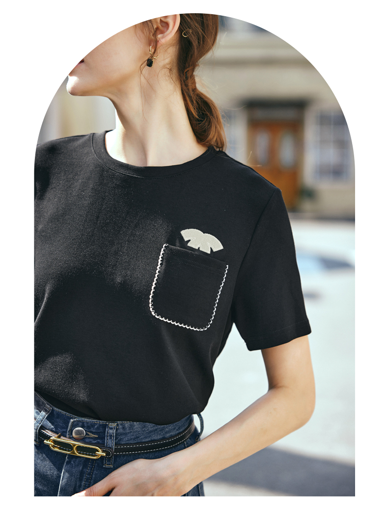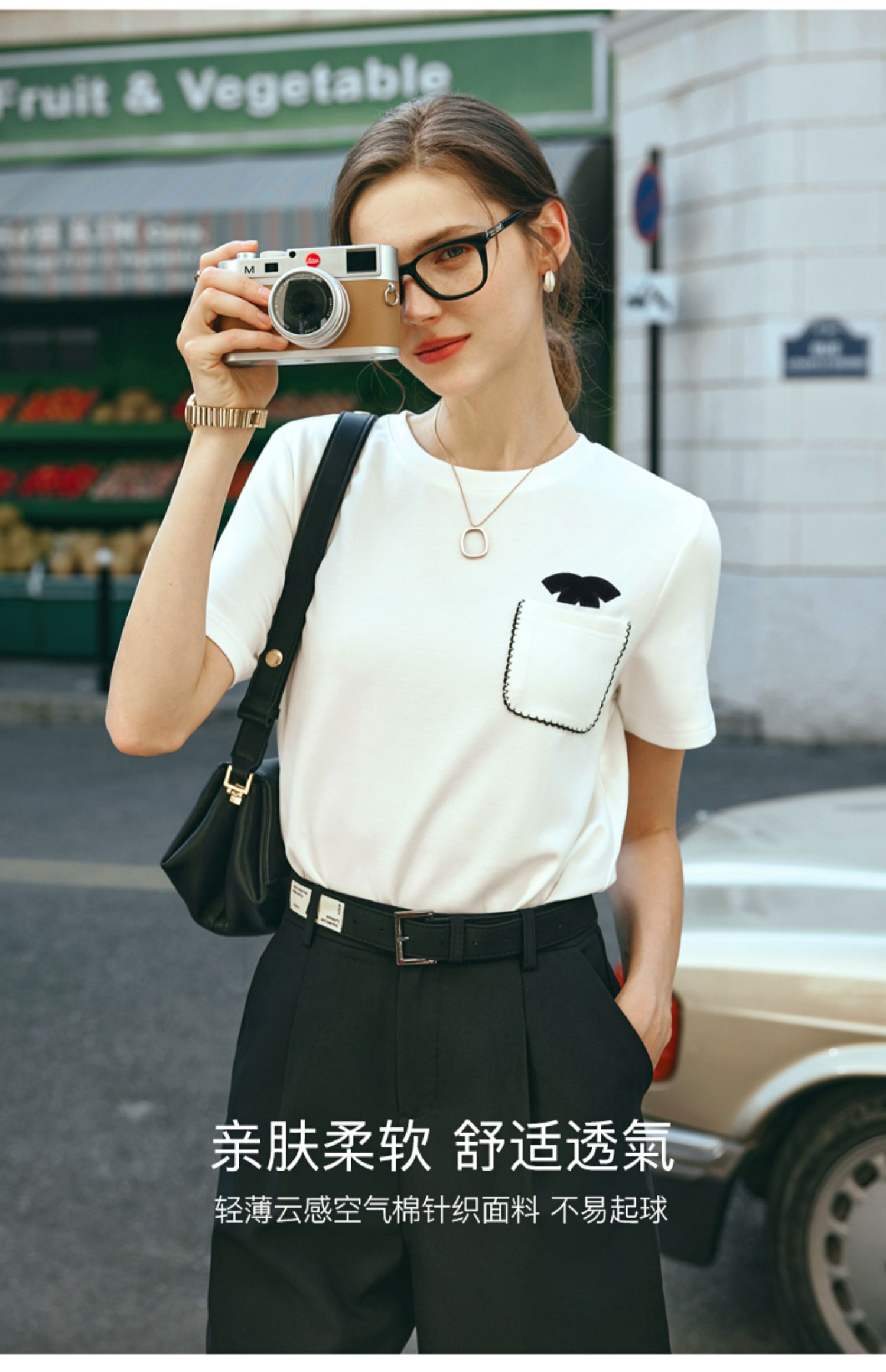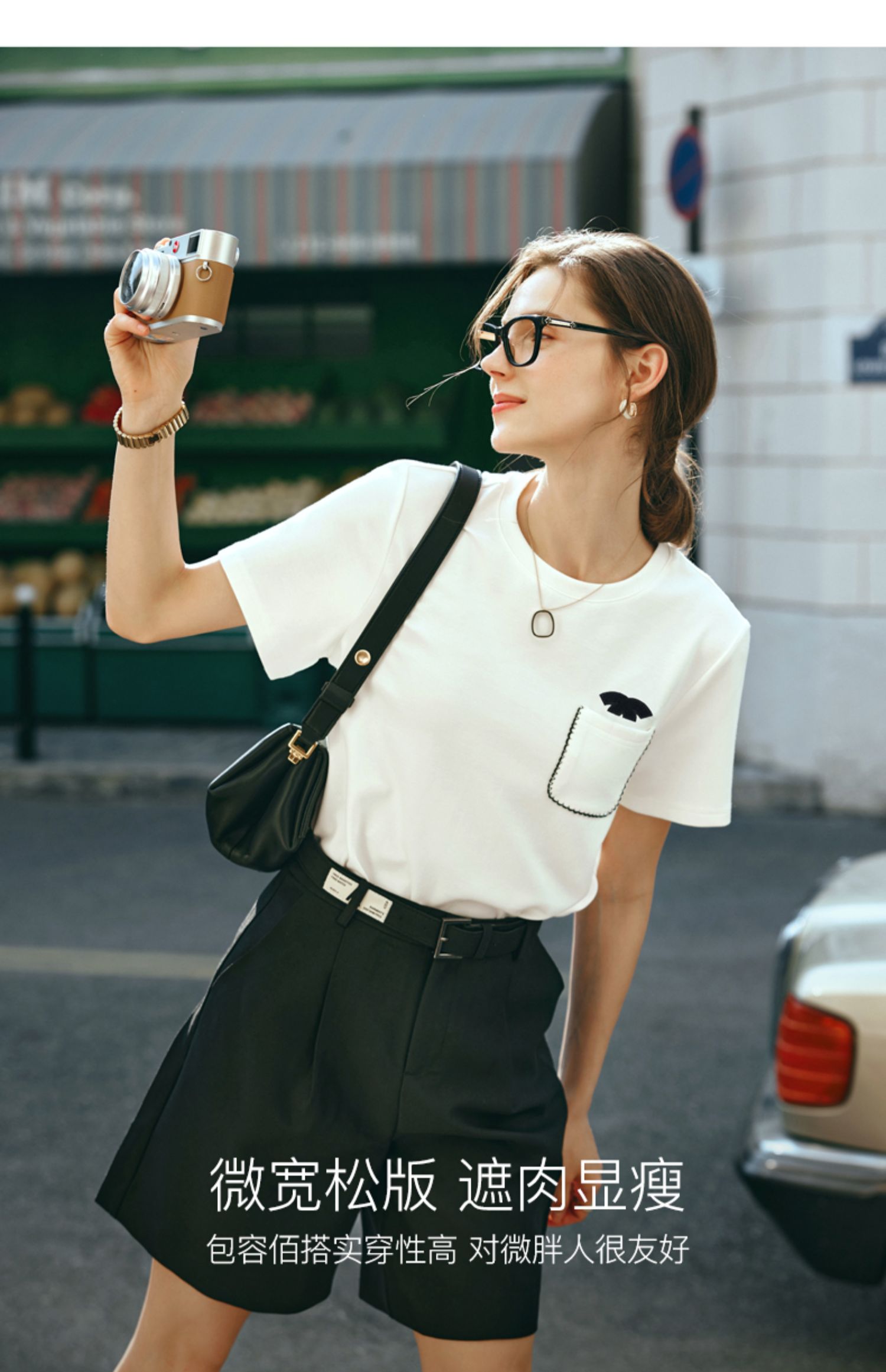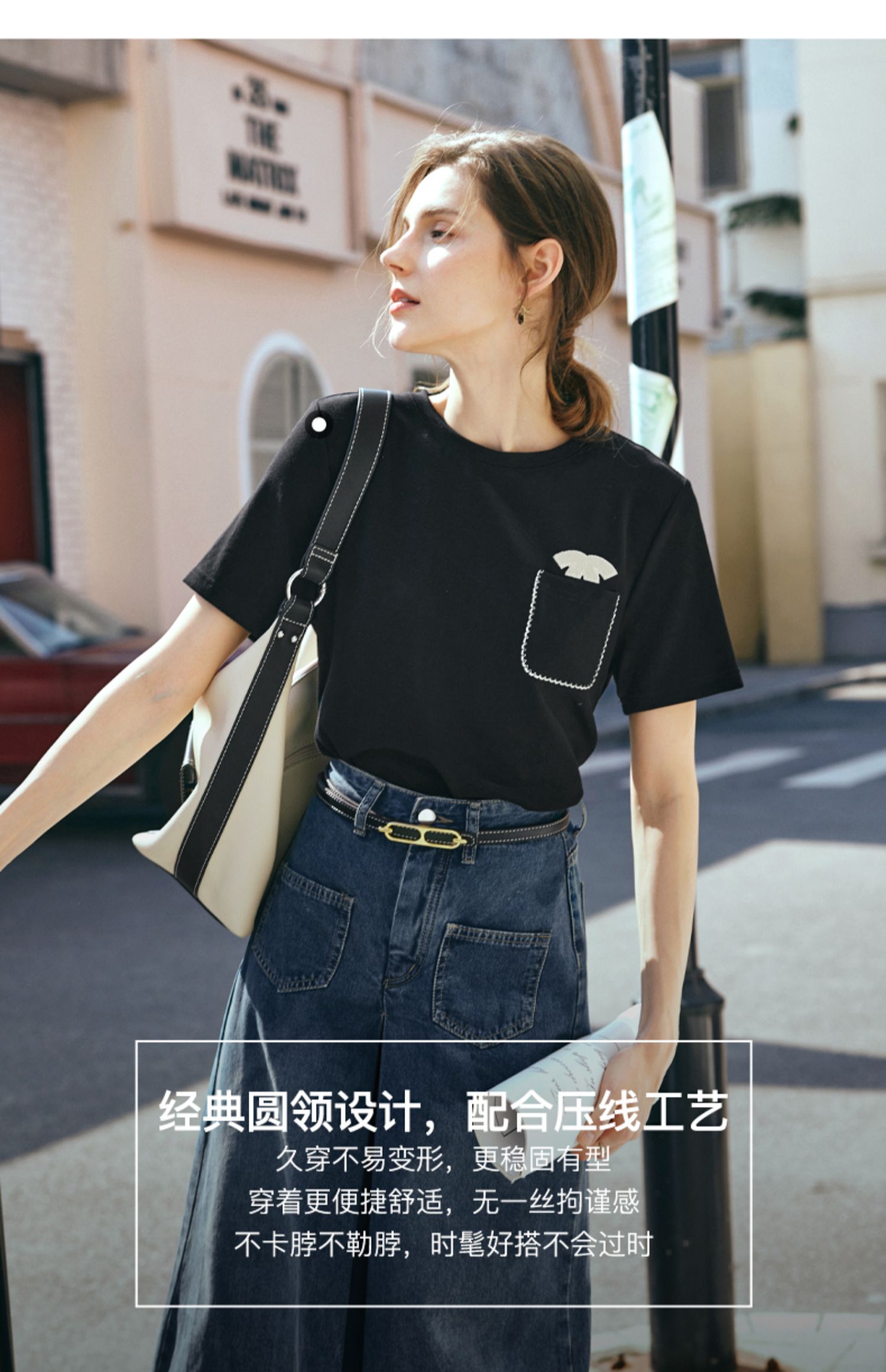 OLrain欧芮儿黑色T恤女早春2024年新款简约百搭刺绣短袖