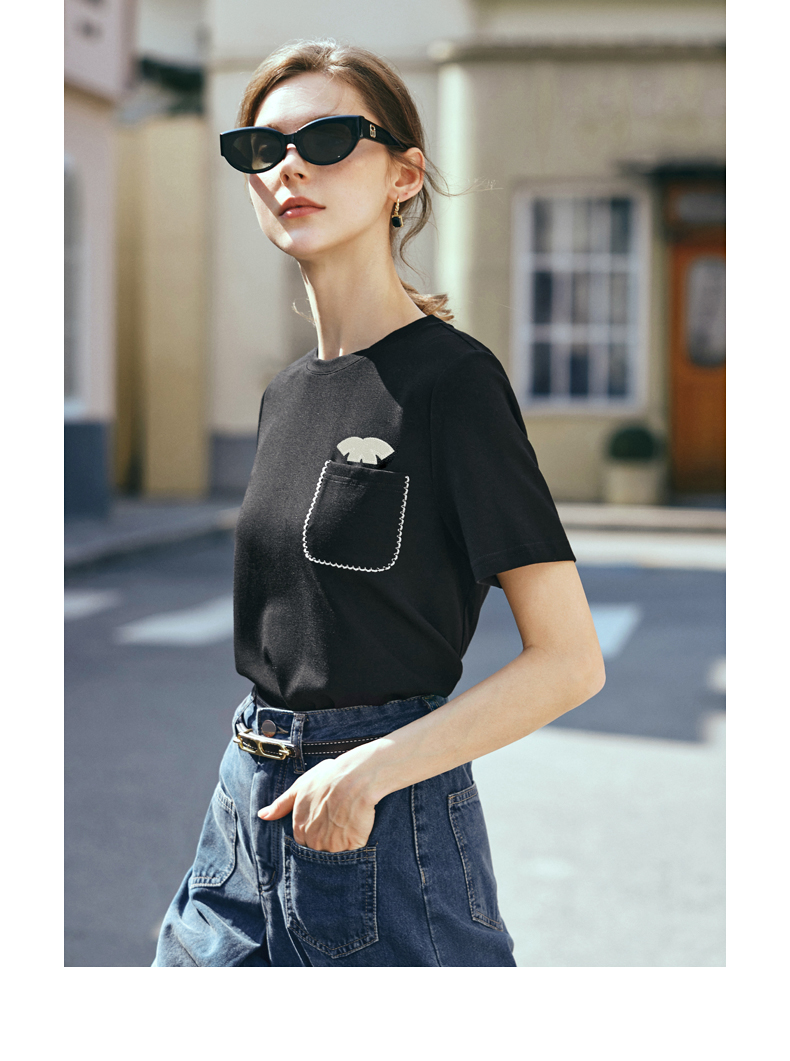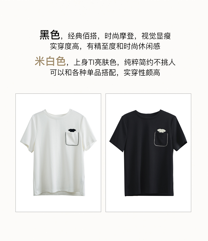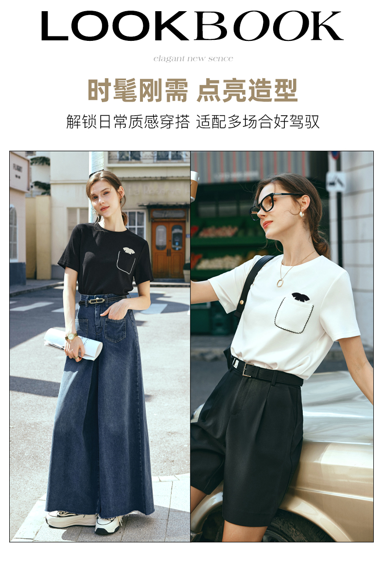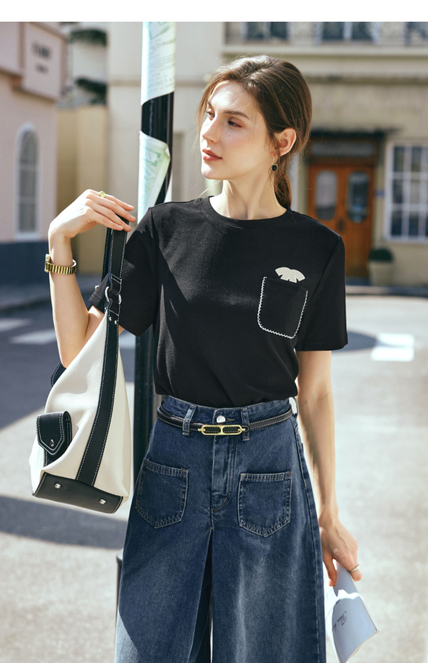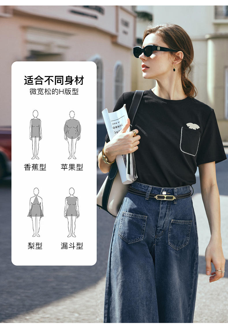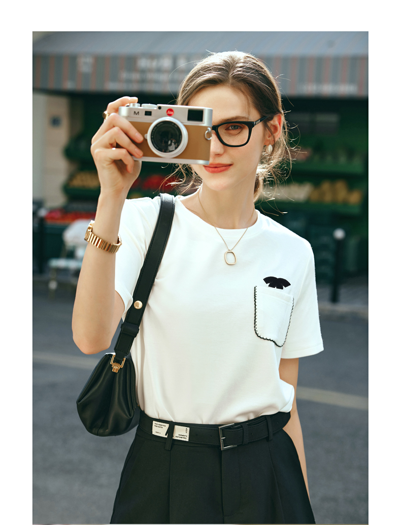 OLrain欧芮儿黑色T恤女早春2024年新款简约百搭刺绣短袖
