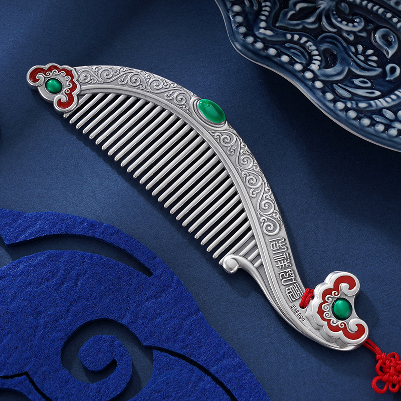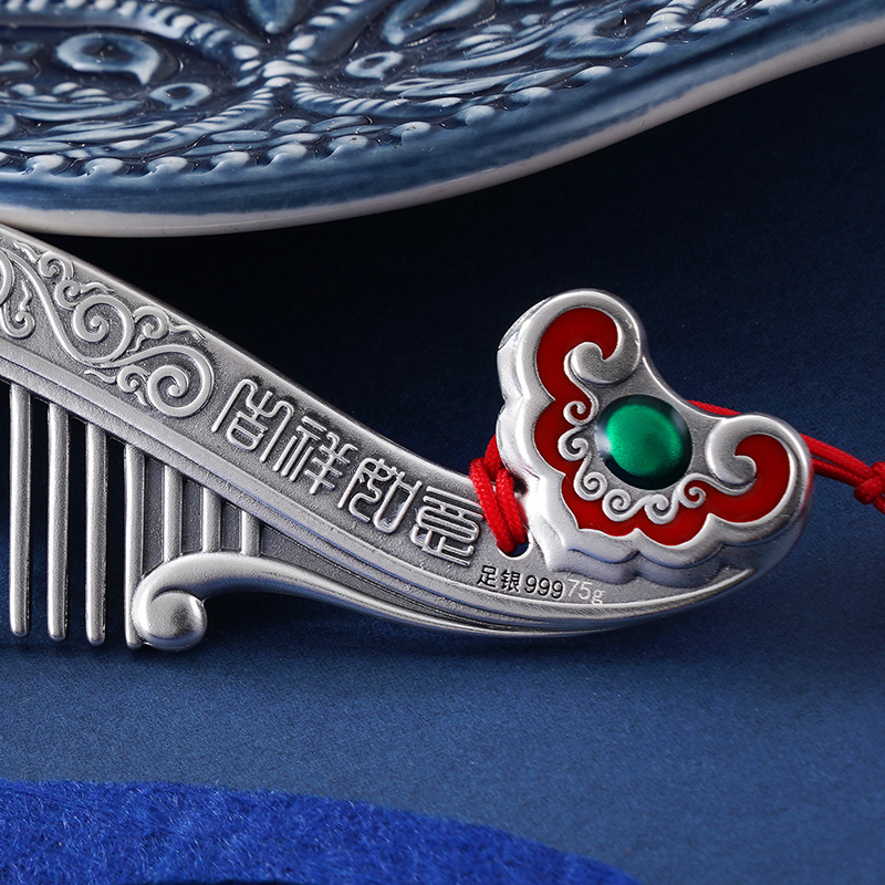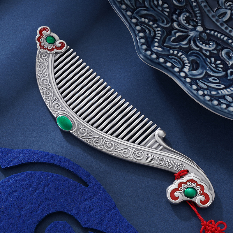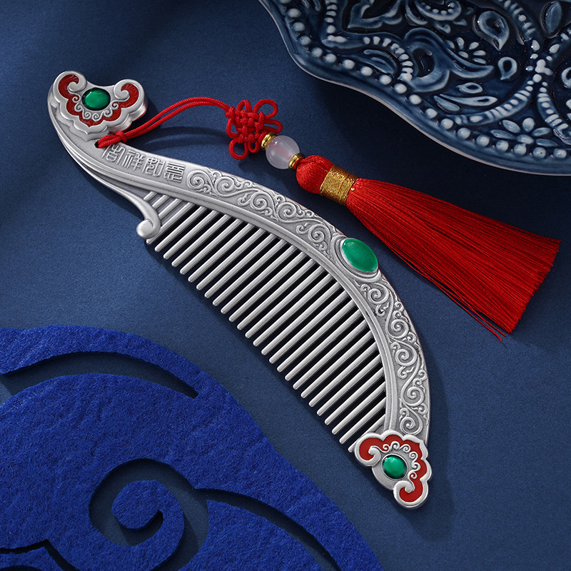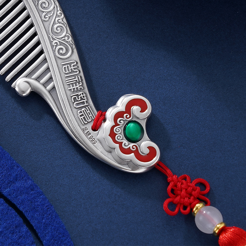 【寓意】:银梳设计灵感源自如意,采用浮雕与珐琅工艺打造。红色流苏点缀,复古华丽。寓意吉祥如意,福禄相伴。