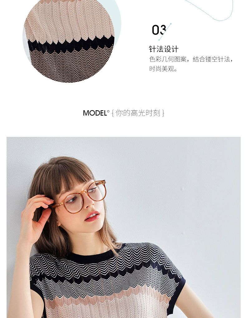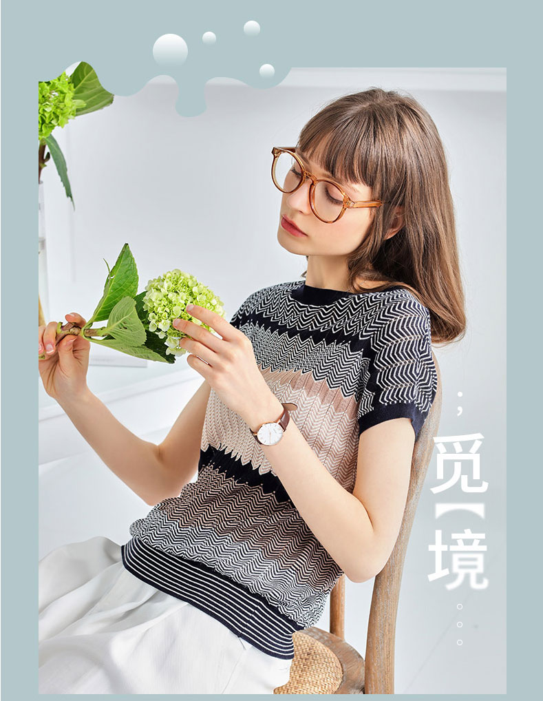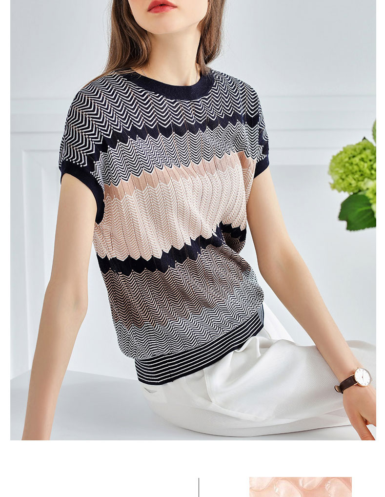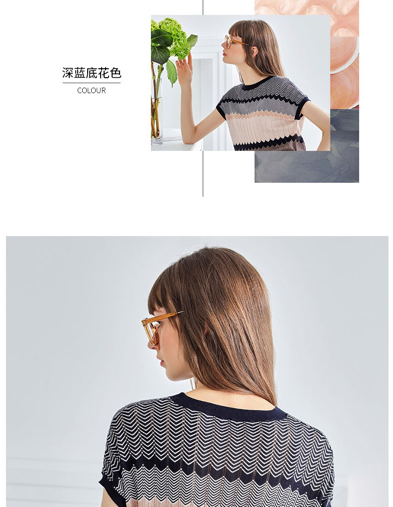 科蒙博卡夏季圆领镂空透气针织真丝上衣女 时尚条纹桑蚕丝T恤KSP1068H4498
