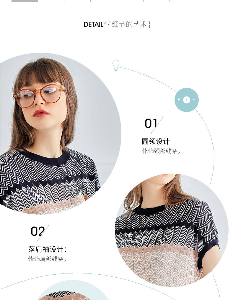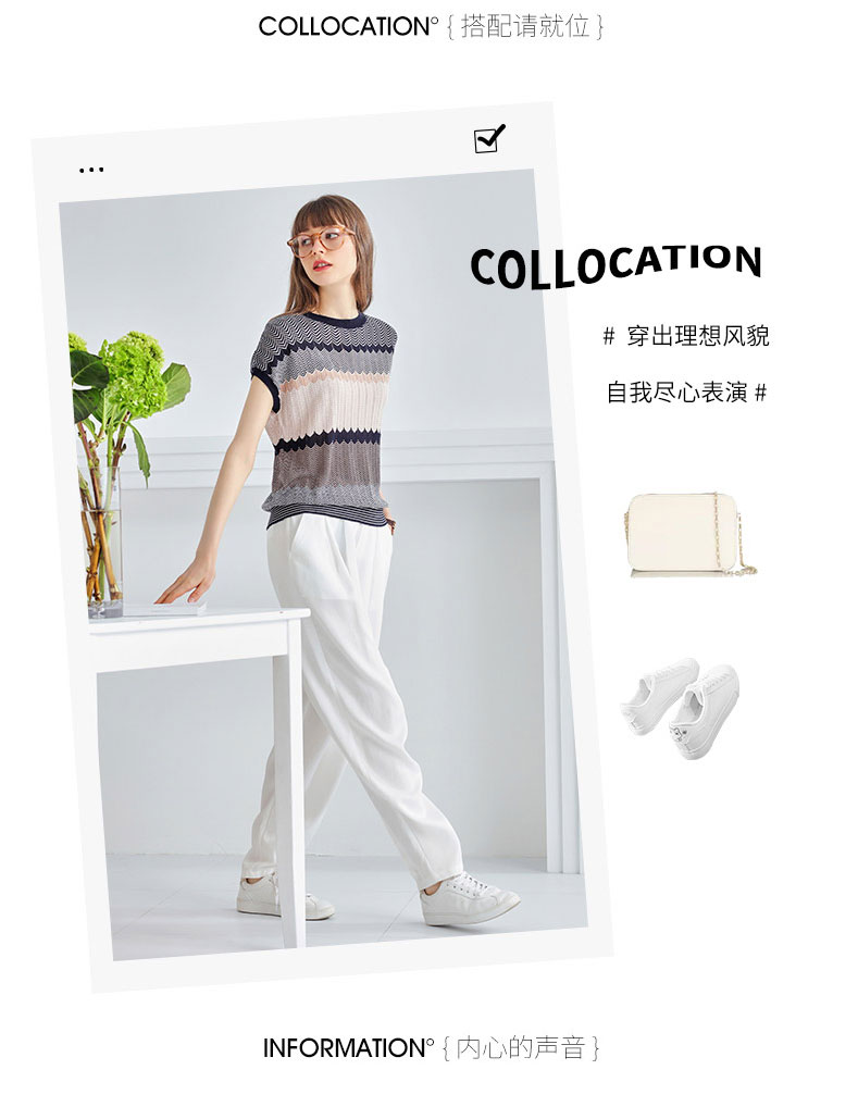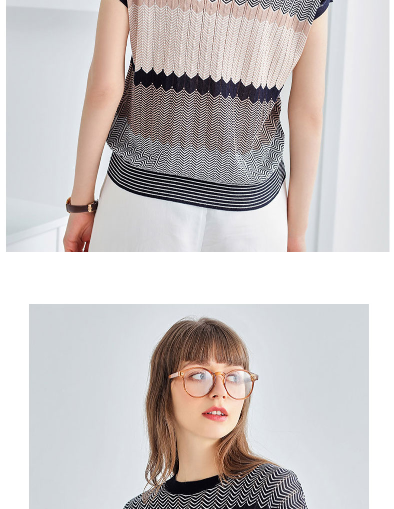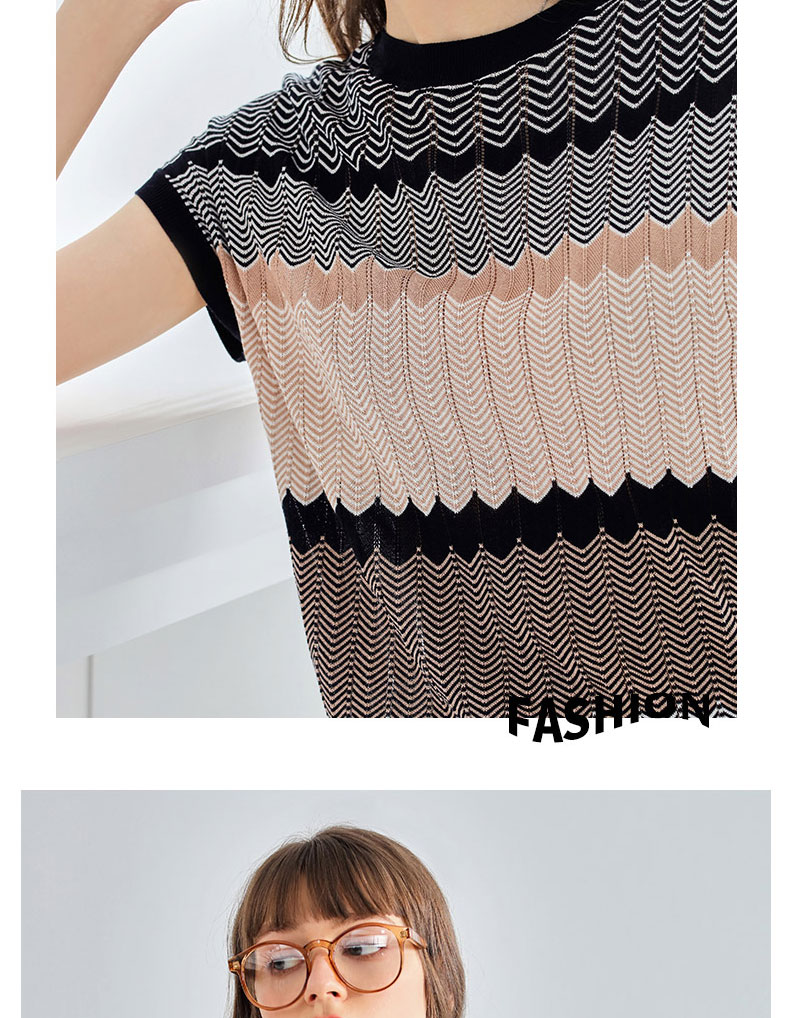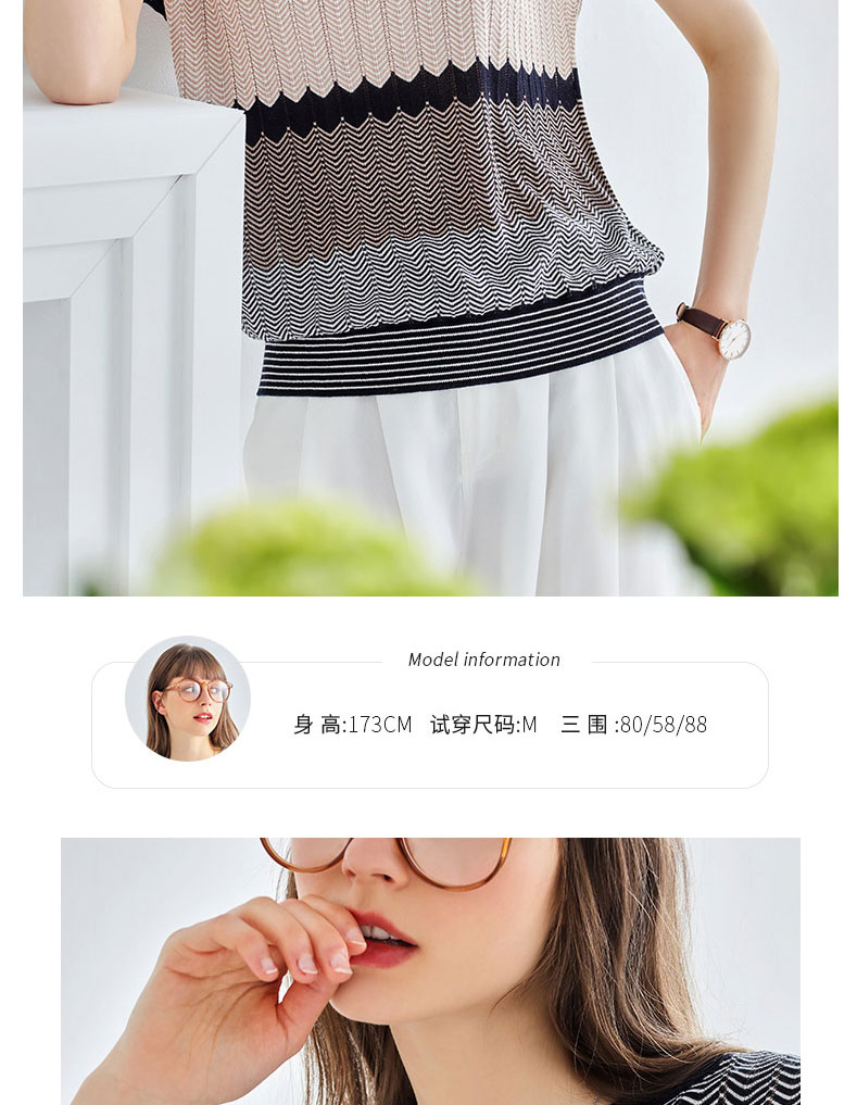 科蒙博卡夏季圆领镂空透气针织真丝上衣女 时尚条纹桑蚕丝T恤KSP1068H4498