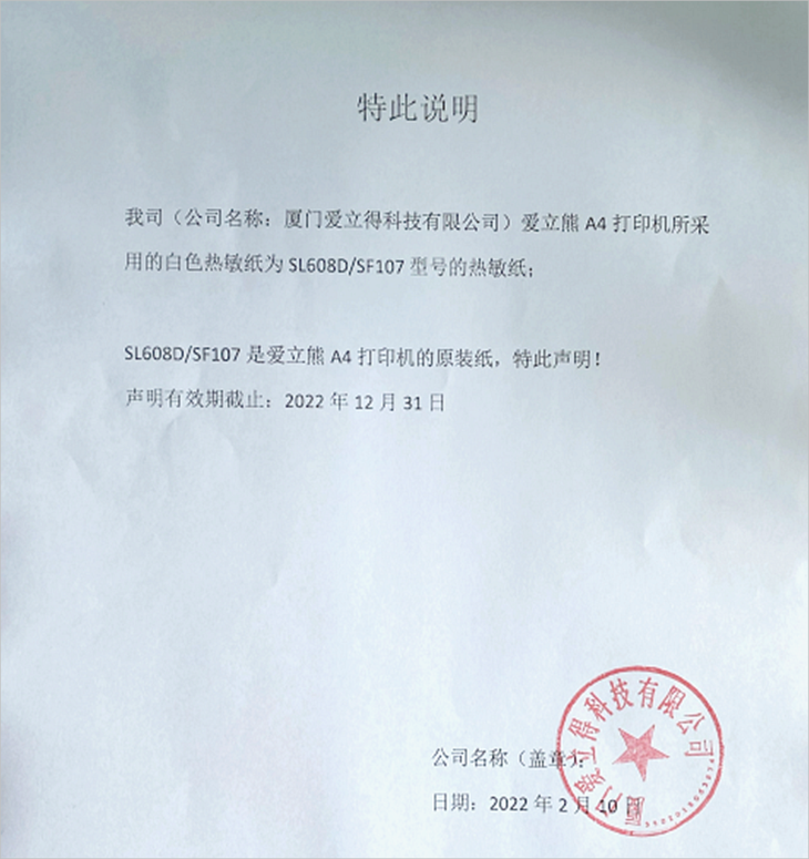 但是因为打印纸上,并没有看到属于SL608D和SF107热敏纸的标识,我又让他们提供了第二次证明,清清楚楚写着,SL608D和SF107是爱立熊A4打印机的原装纸,才算彻底放心了。