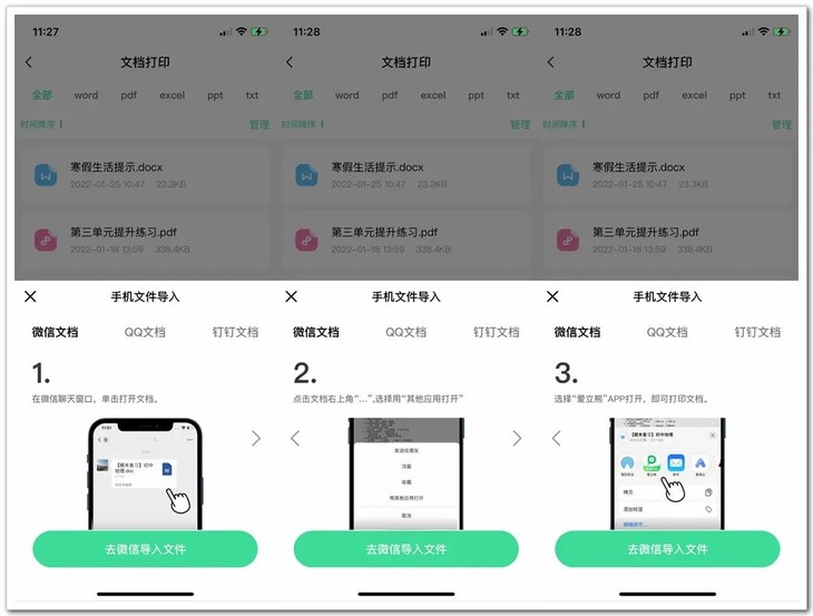 比如打印文档,界面的左下角也都有提示,导入XX文档,微信、QQ、钉钉每个都有具体的操作指南,3步左右,不复杂,看一遍就会了。