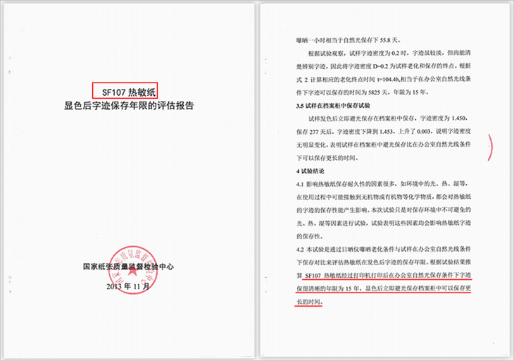 另外,配套的热敏纸的留影时间分3年和10年,品牌方也给我提供了一份证明,我放下10年的,下边是字迹保存年限评估报告(国家纸张质量监督检验中心出具的)↓