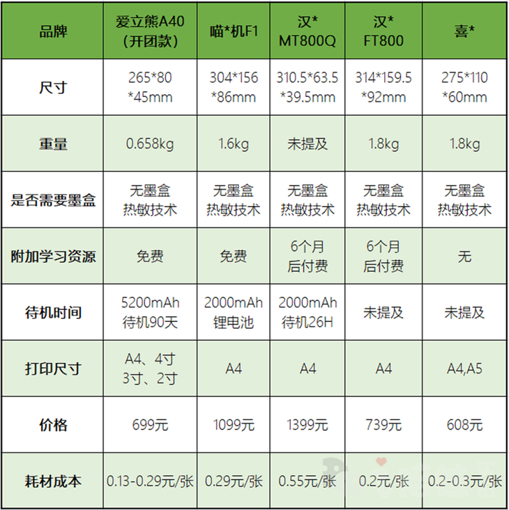 直到去年,其他品牌终于也出了类似功能的迷你A4打印机,我把目前市场上比较热门的口碑机都做了比较,感兴趣的妞可以先看下横评表↓