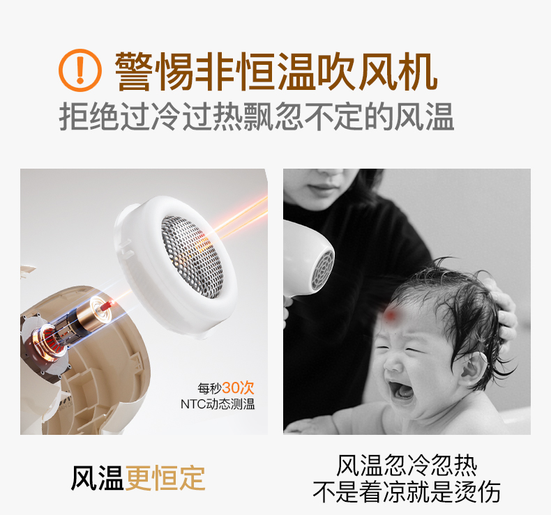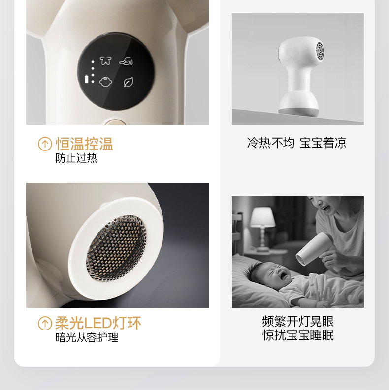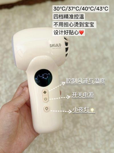 而且这款吹风机有30℃/37℃/40℃/43℃四档精准控温,根据宝宝需求随心调,30℃冷风模式吹冷辅食、37℃吹pp模式防止红pp、40℃-43℃吹头发模式防止着凉;13000 转高速电机,宝宝长头发也快~还能消除发梢静电,头发柔顺不毛躁![偷笑R]