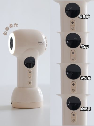 四档风力调节,设有“身体37度”“屁屁40度”“头发43度”“自然风30度”