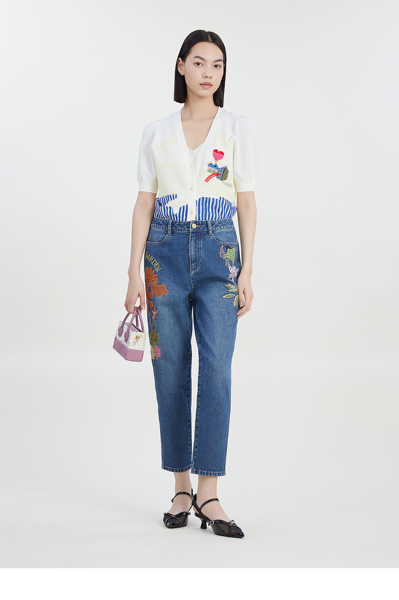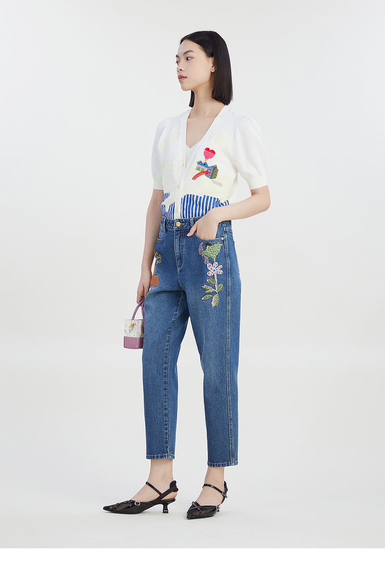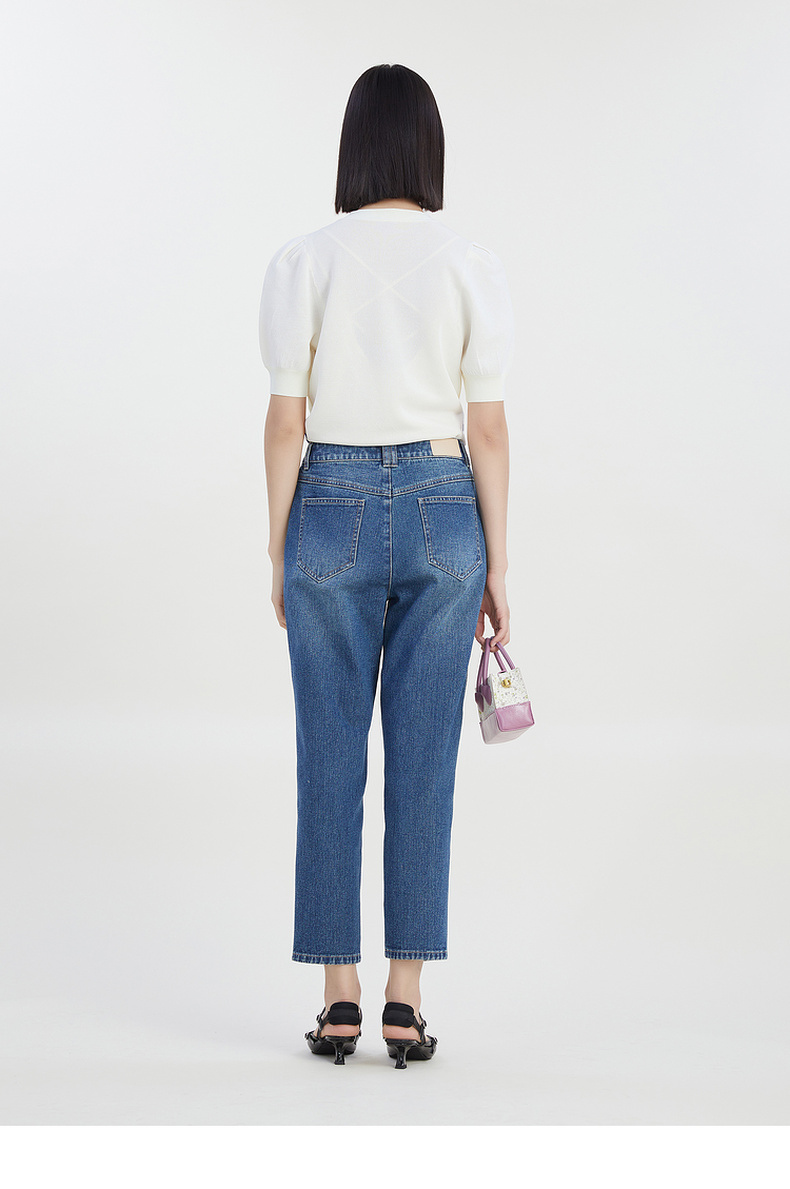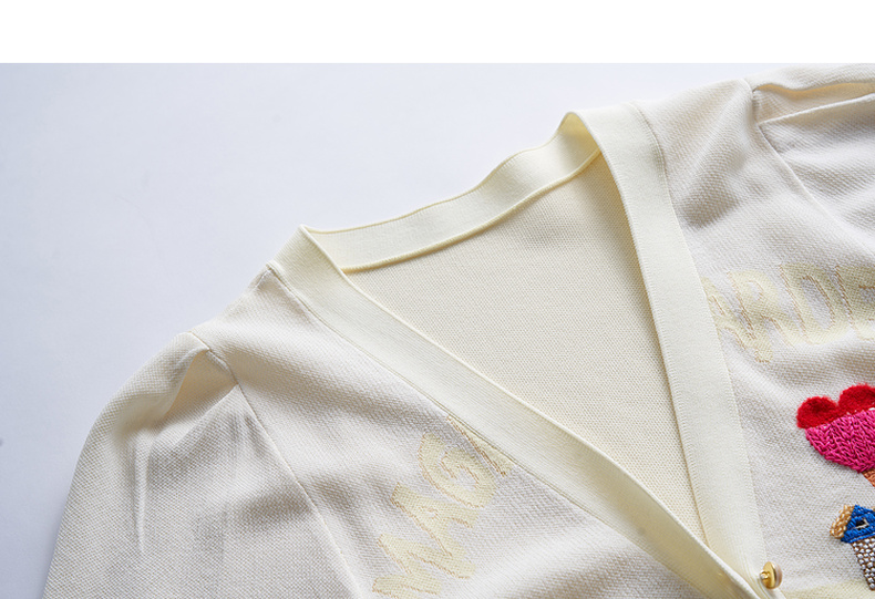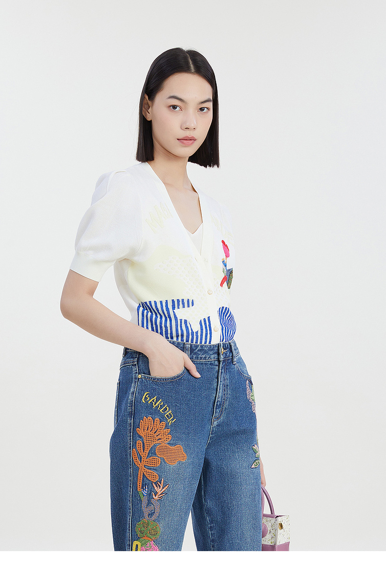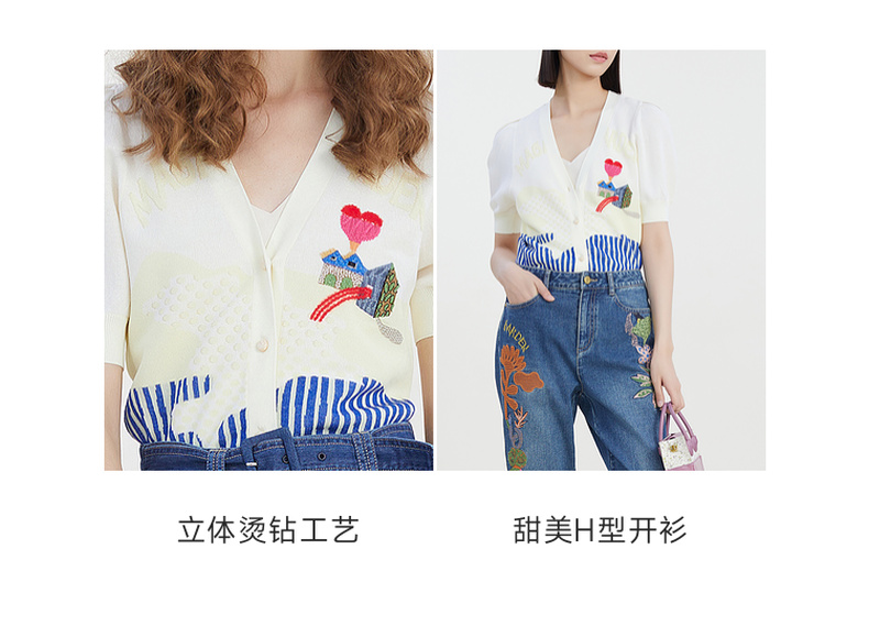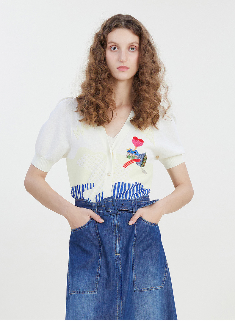 谜底2023夏季新款短款针织开衫女V领泡泡袖针织衫短袖232MZ0890
