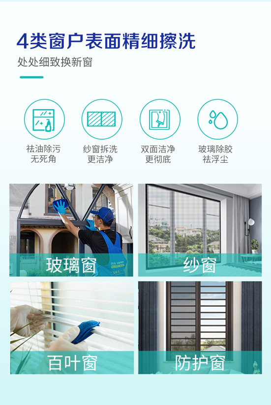 1、窗户表面:玻璃窗、纱窗、百叶窗、防护窗精细擦洗(纱窗深度拆洗,不可拆卸的纱窗除外)