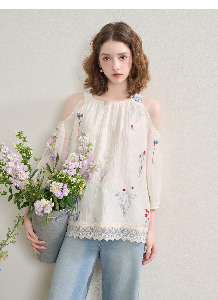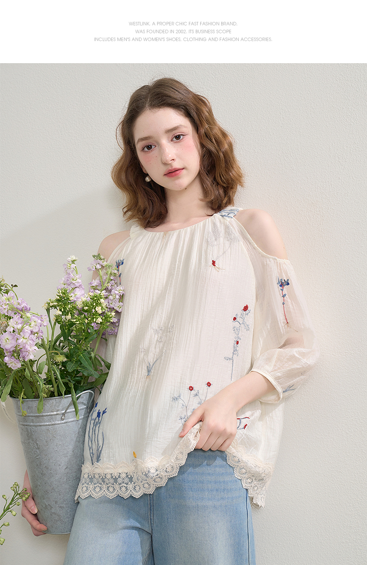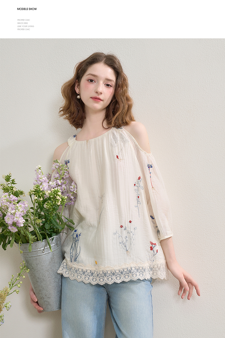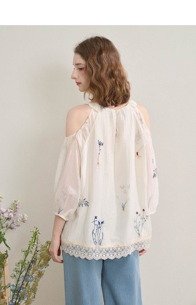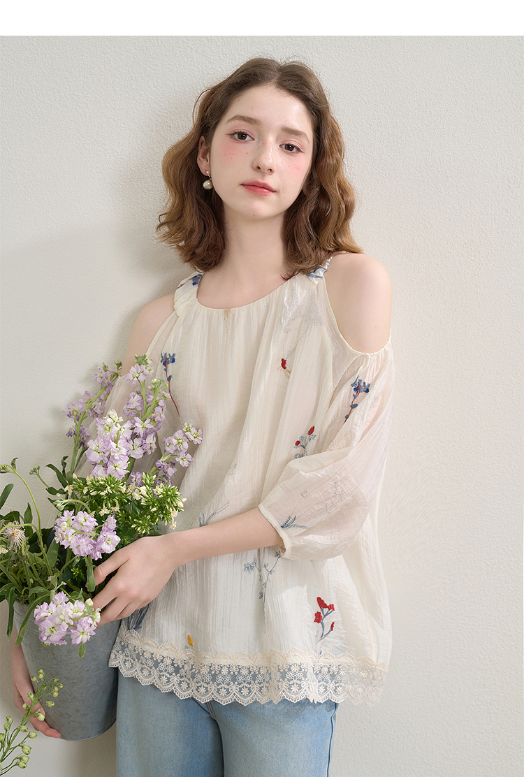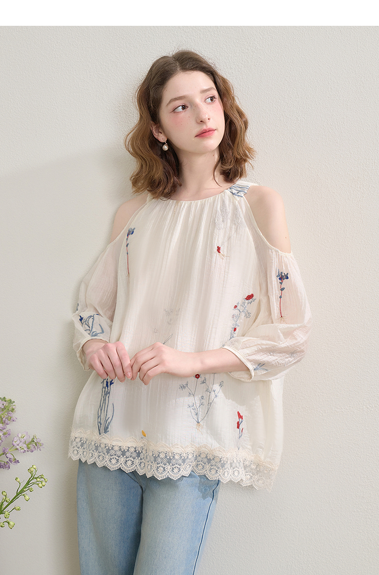 法式文艺刺绣拼接花边露肩衬衫女夏季莱赛尔宽松百搭上衣V1550968