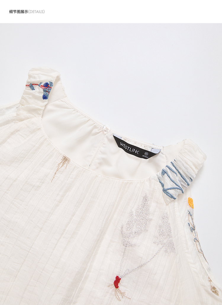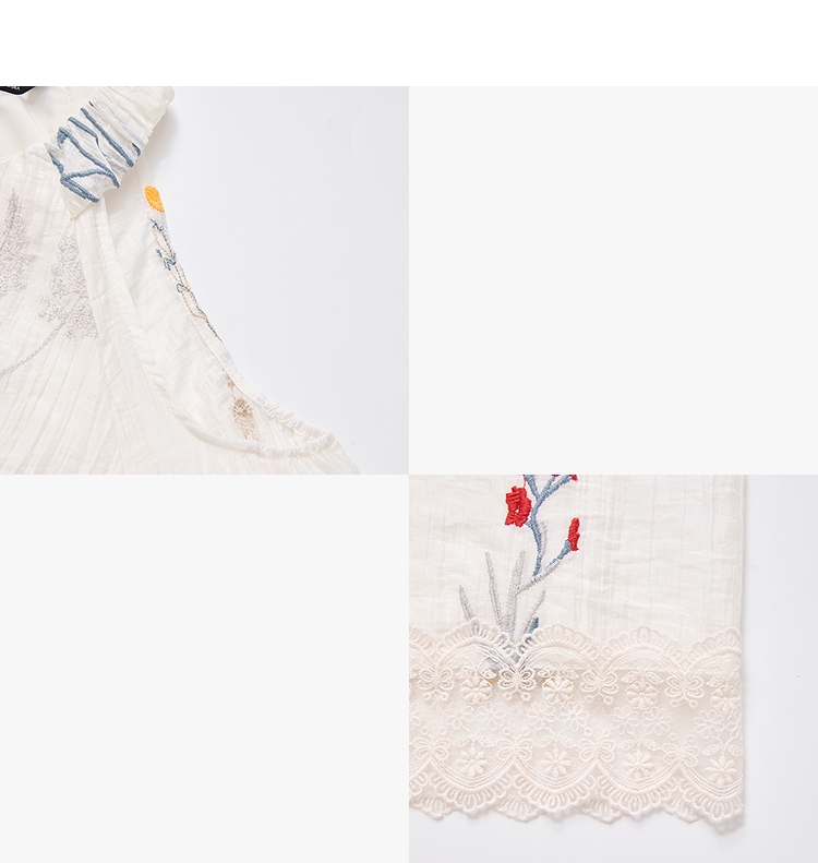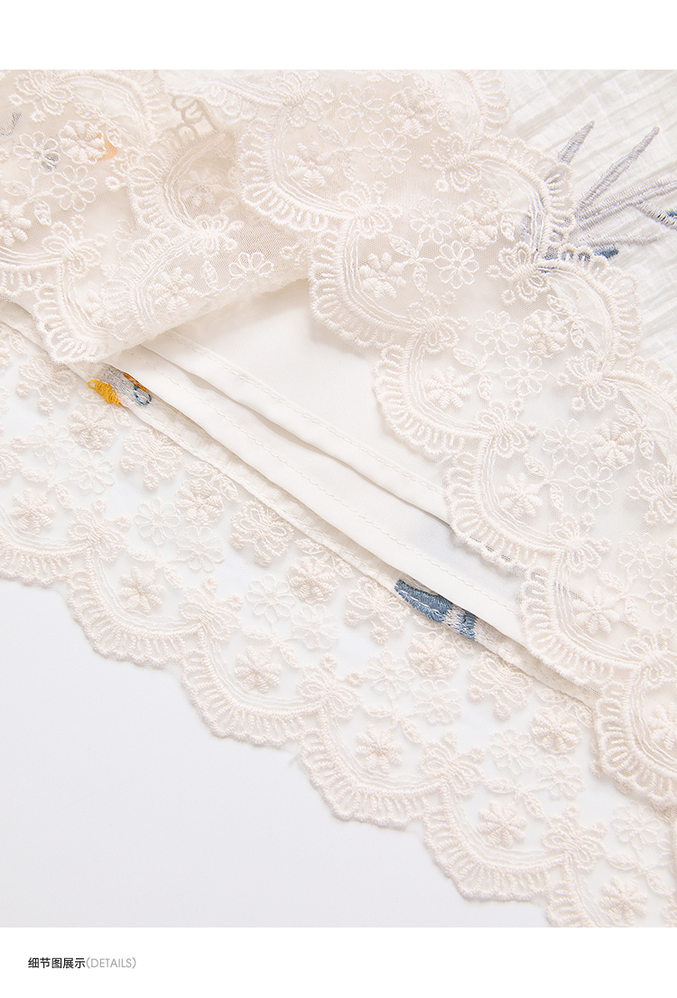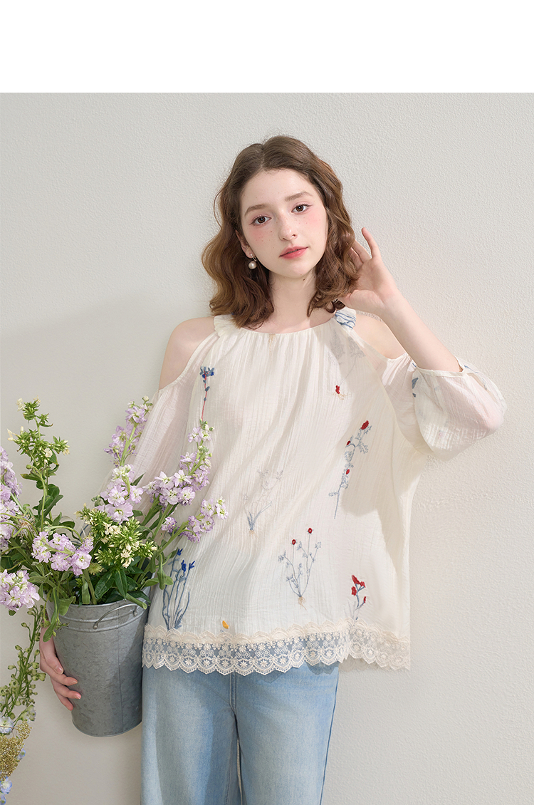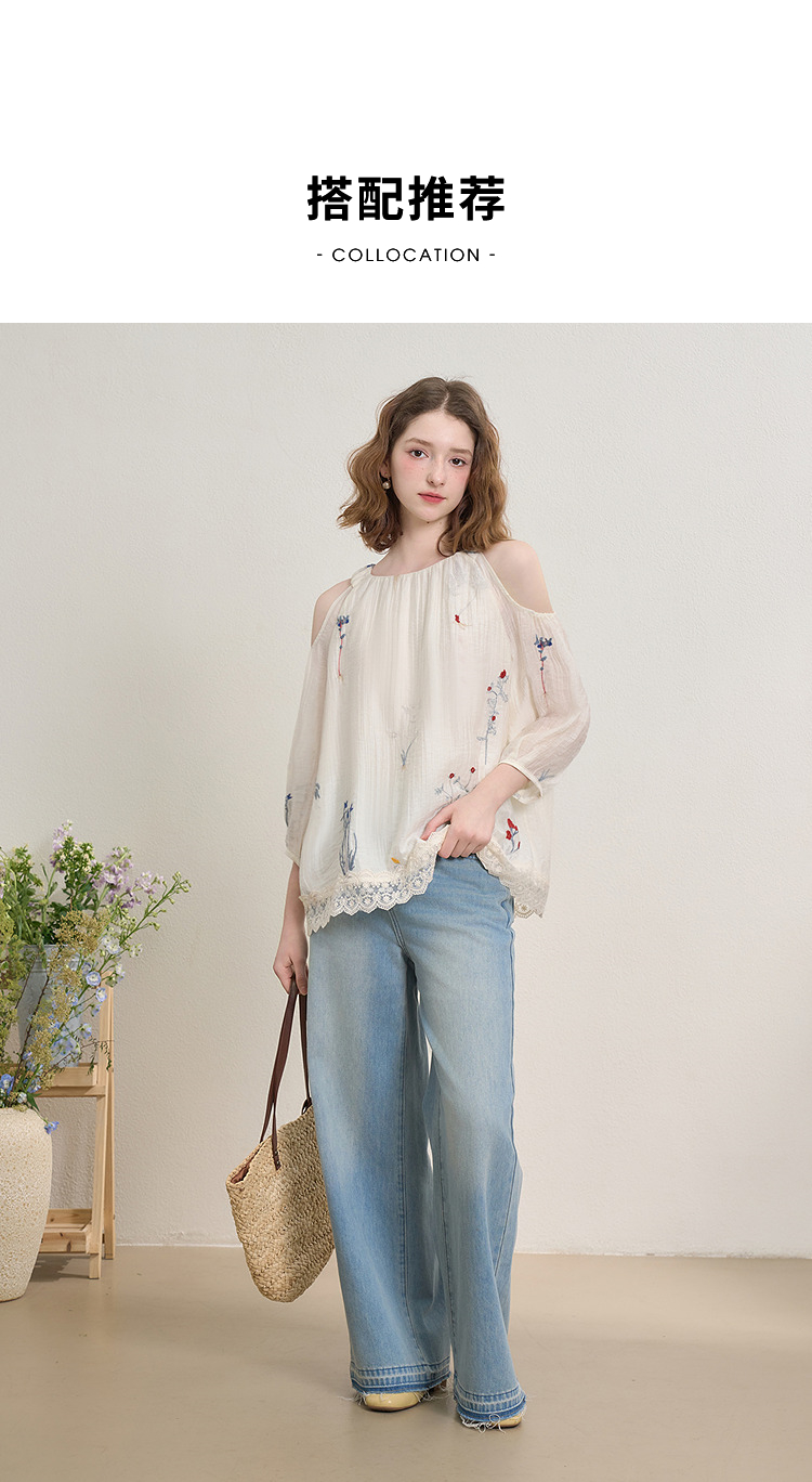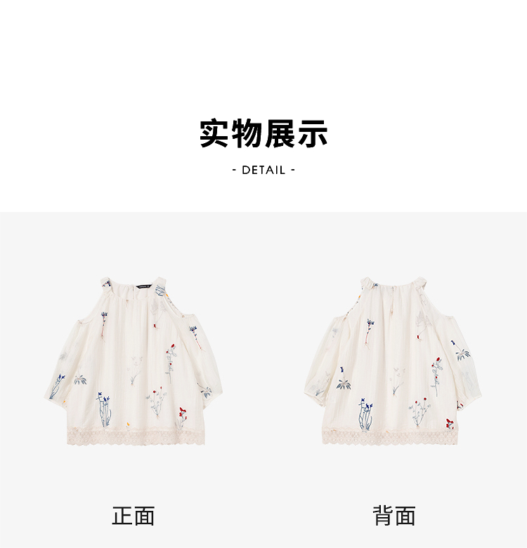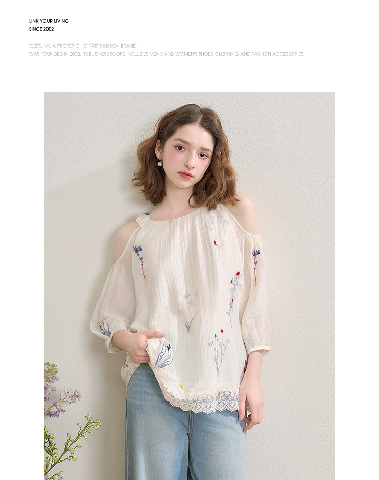 法式文艺刺绣拼接花边露肩衬衫女夏季莱赛尔宽松百搭上衣V1550968