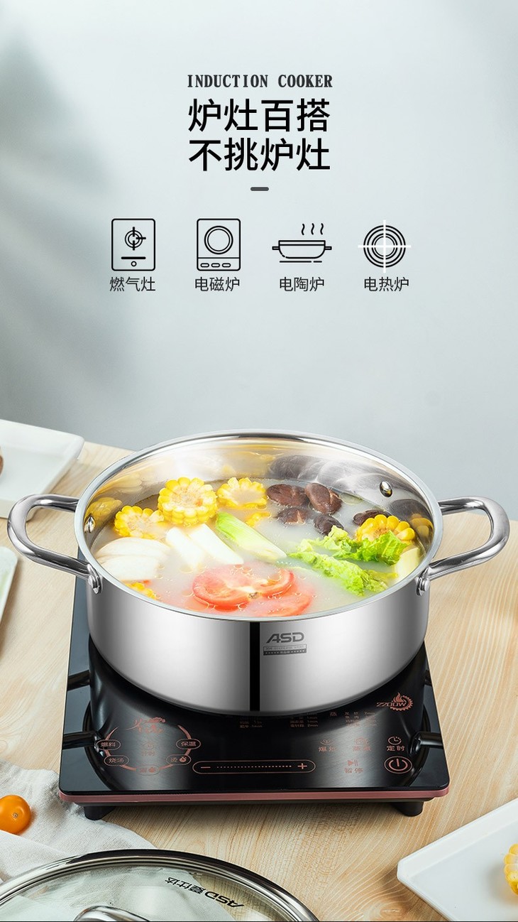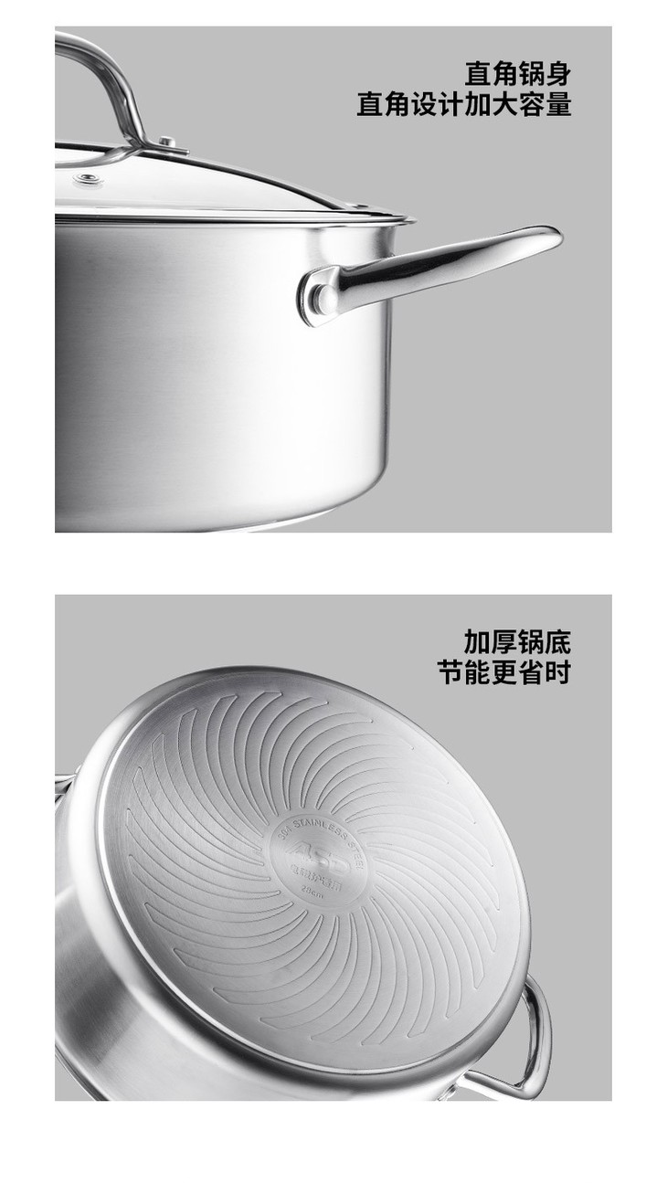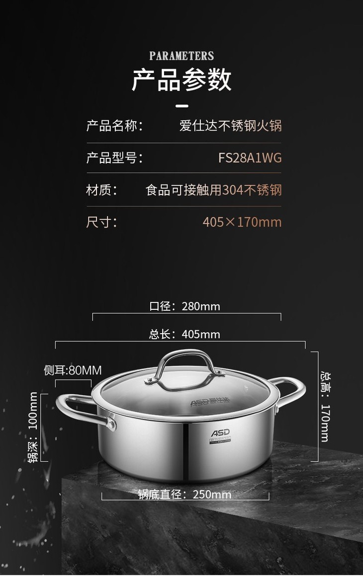 爱仕达(ASD)304不锈钢直身火锅汤锅一锅多用 加厚复底燃气明火电磁炉通用 28CM 清汤火锅 FS28A1WG