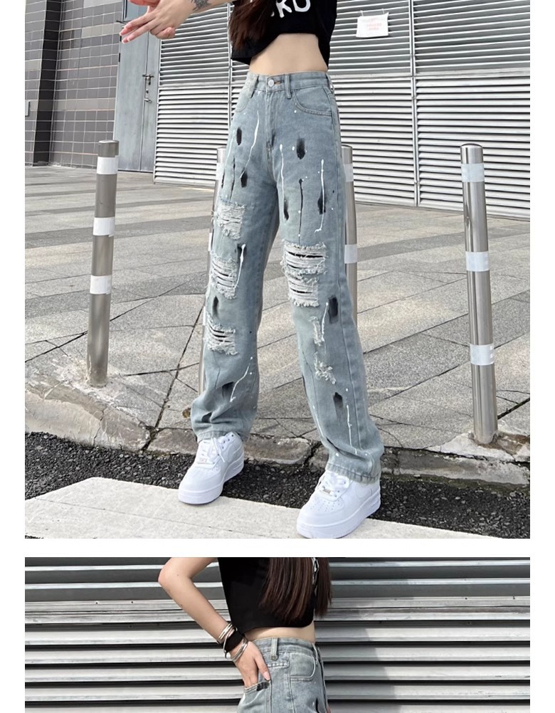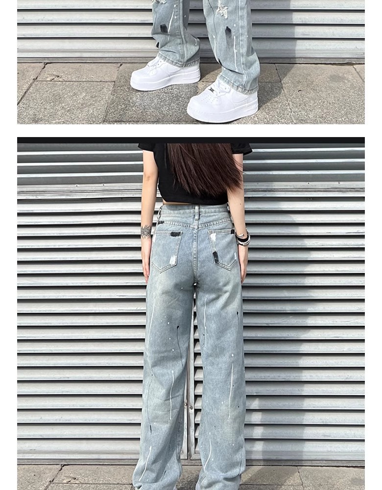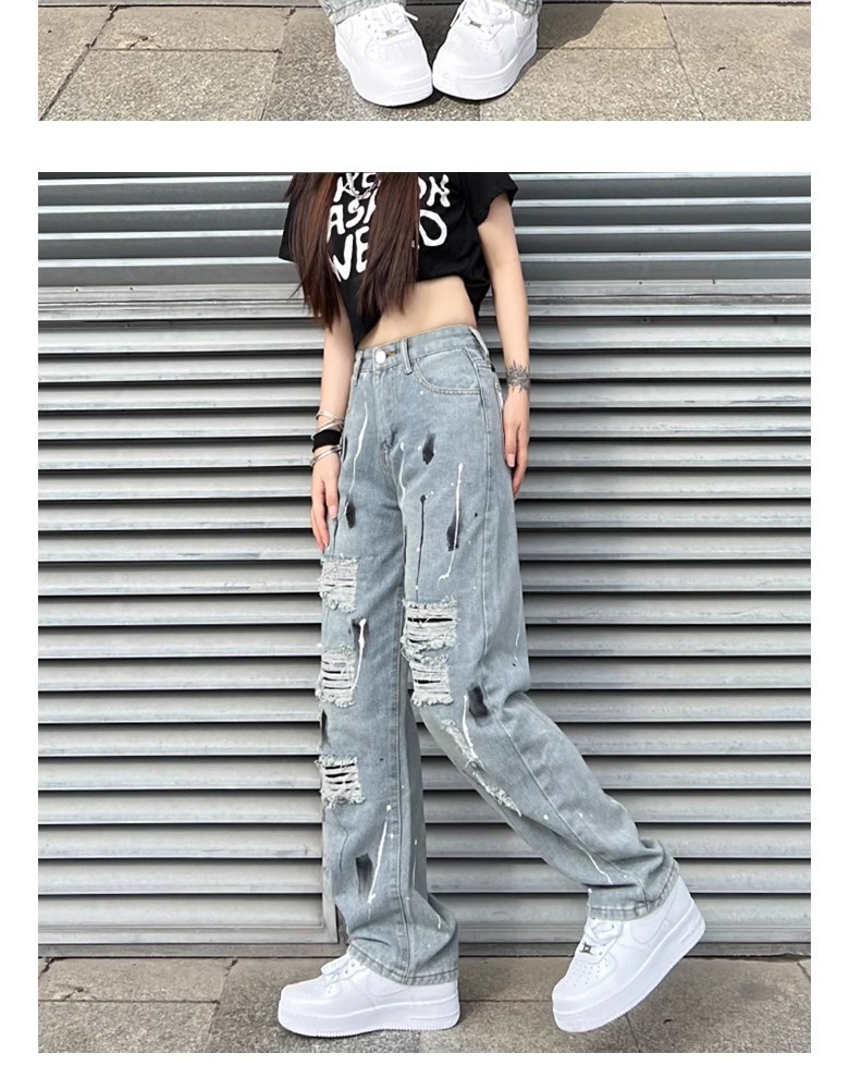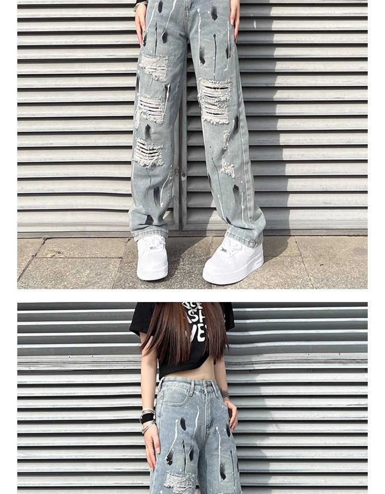 泼墨破洞牛仔裤女新款ins潮高街显瘦遮肉百搭宽松直筒阔腿拖地裤.