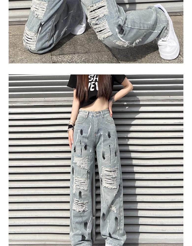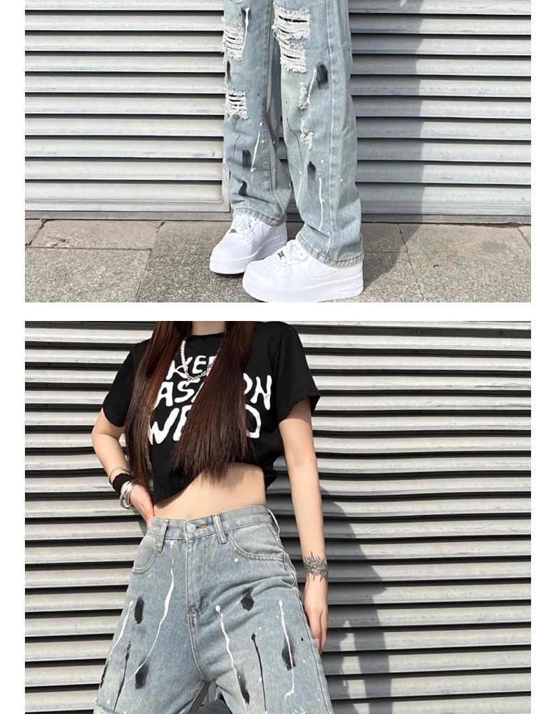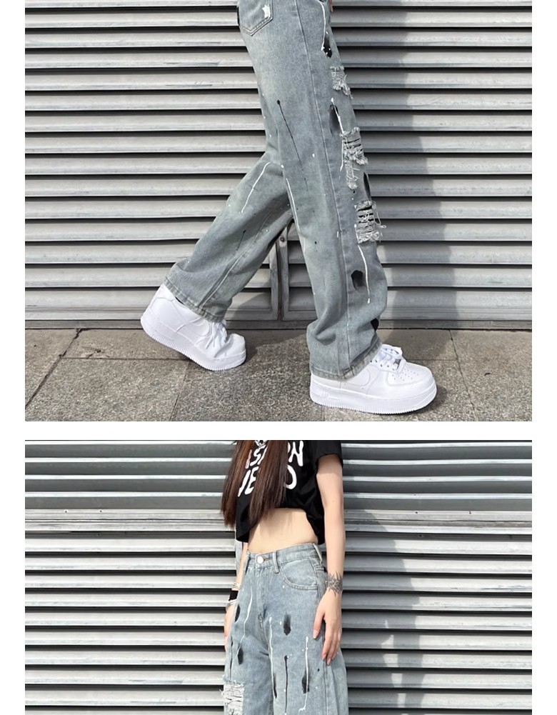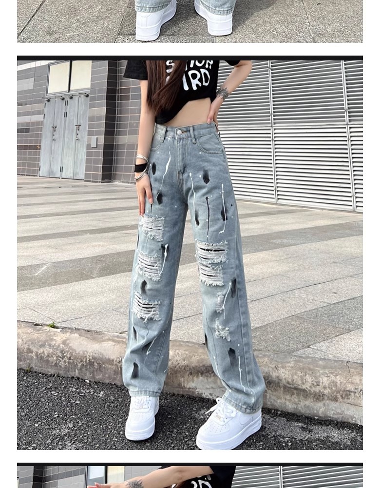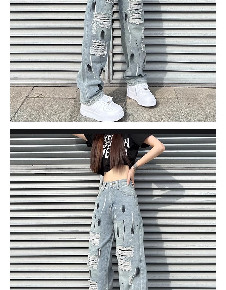泼墨破洞牛仔裤女新款ins潮高街显瘦遮肉百搭宽松直筒阔腿拖地裤.