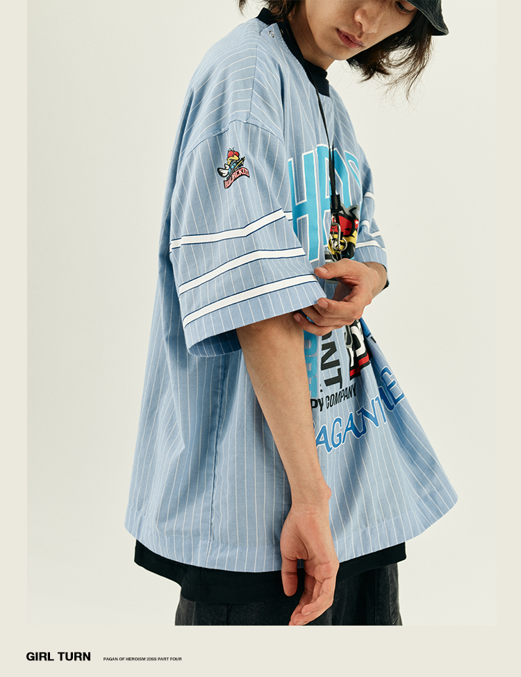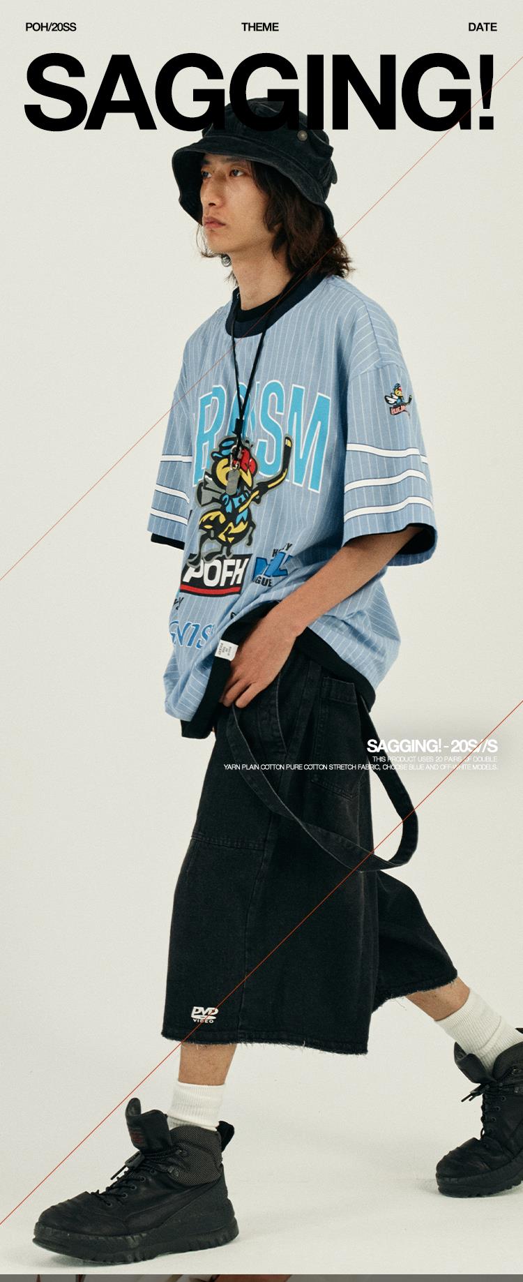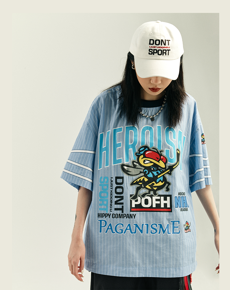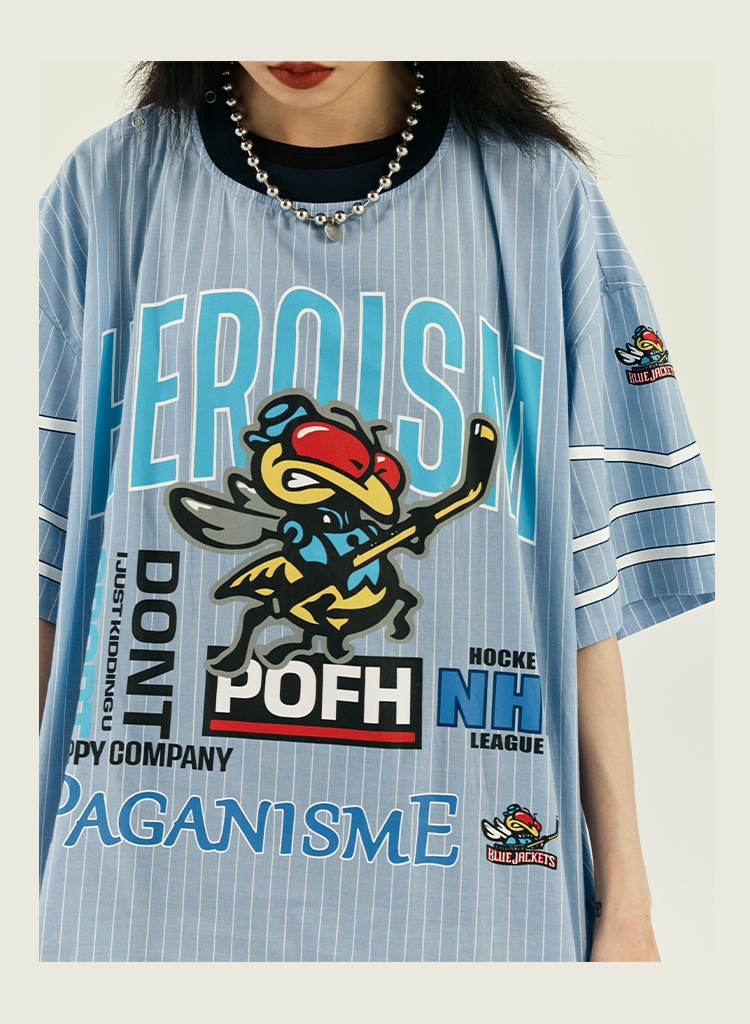 POH 冰球联盟印花蓝色条纹衬衣男做旧嘻哈宽松运动服短袖套头衬衫