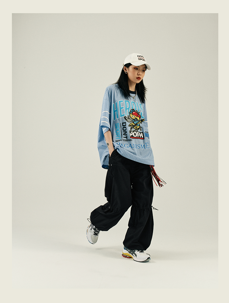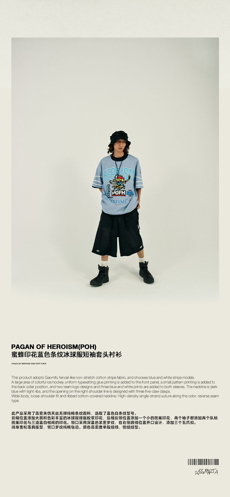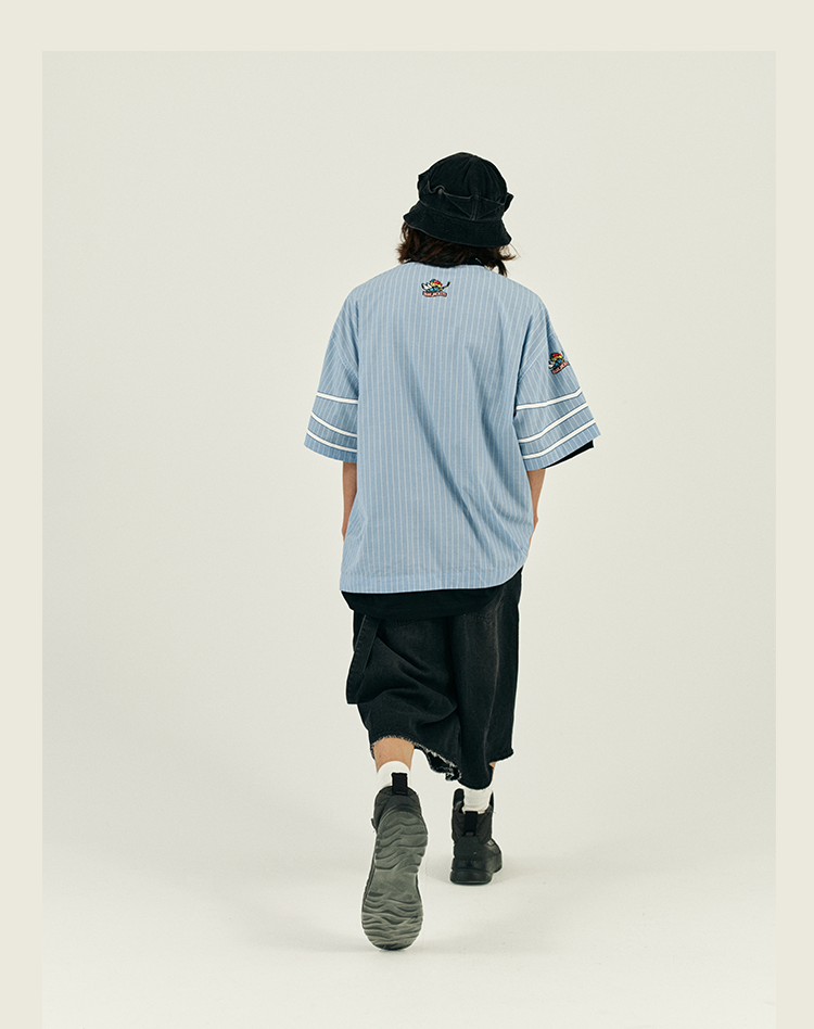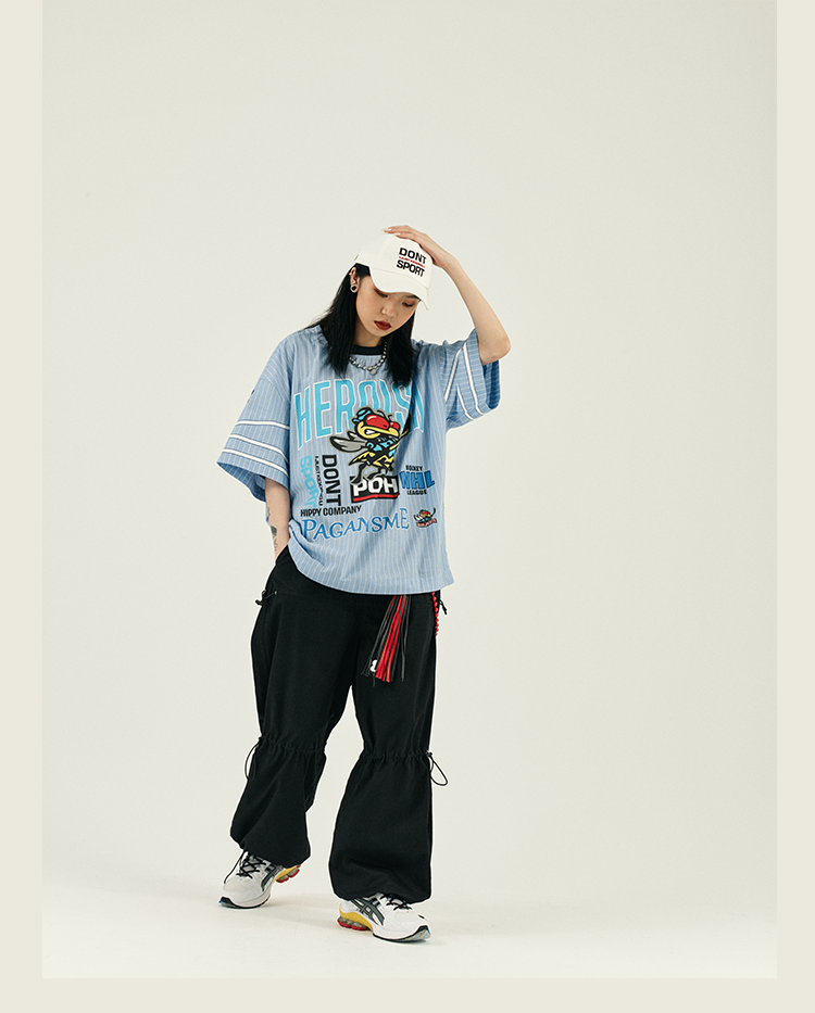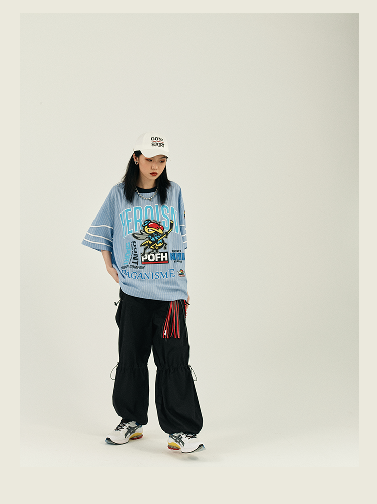 POH 冰球联盟印花蓝色条纹衬衣男做旧嘻哈宽松运动服短袖套头衬衫
